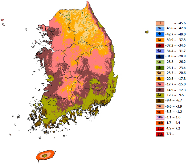 ※ 출처: 농촌진흥청 국립원예특작과학원(www.nihhs.go.kr), 식물 내한성지도