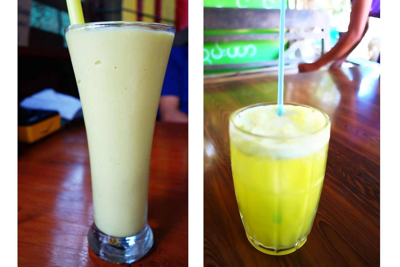 시뽀에서 샨족마을로 트레킹을 다녀오면서, 하늘을 덮는 고목나무 앞의 '얀얀셰이크'에서는 둘이서 한 번에 종류별로 4잔의 셰이크를 마셨다. 아보카도와 커피를 섞어 만든 셰이크는 정말 맛있다.