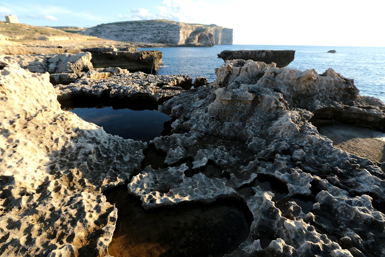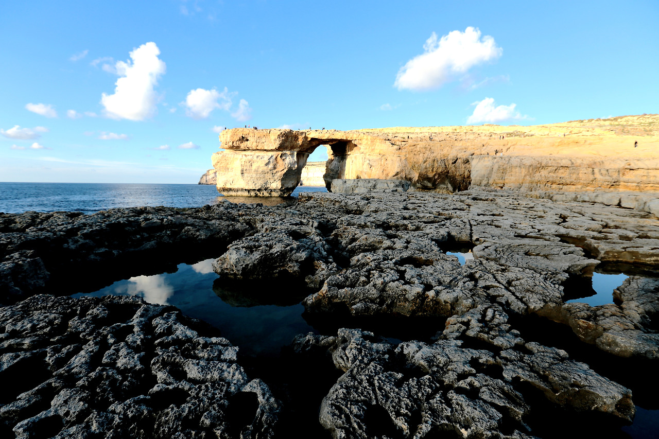 Azure Window는 내가 알고 있는 세상에서 가장 아름다운 창이다. 푸른 하늘을 향해 뚫려있는 창만큼 내 눈이 공감한다. 이 곳은 스카이다이버뿐만 아니라 다이버들에게는 멋진 다이빙 스팟이기도 하단다. 하지만 해마다 많은 사람들이 다이빙을 하거나 물놀이 중 생명을 잃기도 하는 곳이란다. 아주르윈도우 뿐만 아니라 넓게 펼쳐진 회색빛 석회암지대는 크고 작은 둥근 웅덩이들로 인해 볼수록 장관이다. 어디에서 불쑥 신화 속 인물이 나타날 것만 같다.
