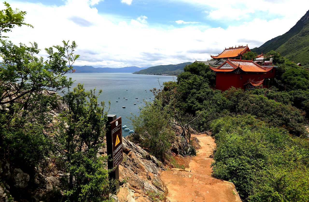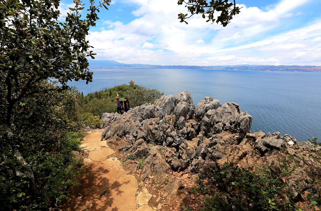 잠깐 쿤밍 교외로 나가나 싶더니 두 시간도 안돼 키가 큰 나무가 보이는 한적한 호숫가 풍경이 나타난다. 푸른 하늘은 깊고 맑은 푸시엔 후의 아름다움을 유감없이 보여주고 호숫가에 피어있는 야생화와 이제는 높게 올라가 있는 구름만 보고 있어도 더 바랄 것이 없다.