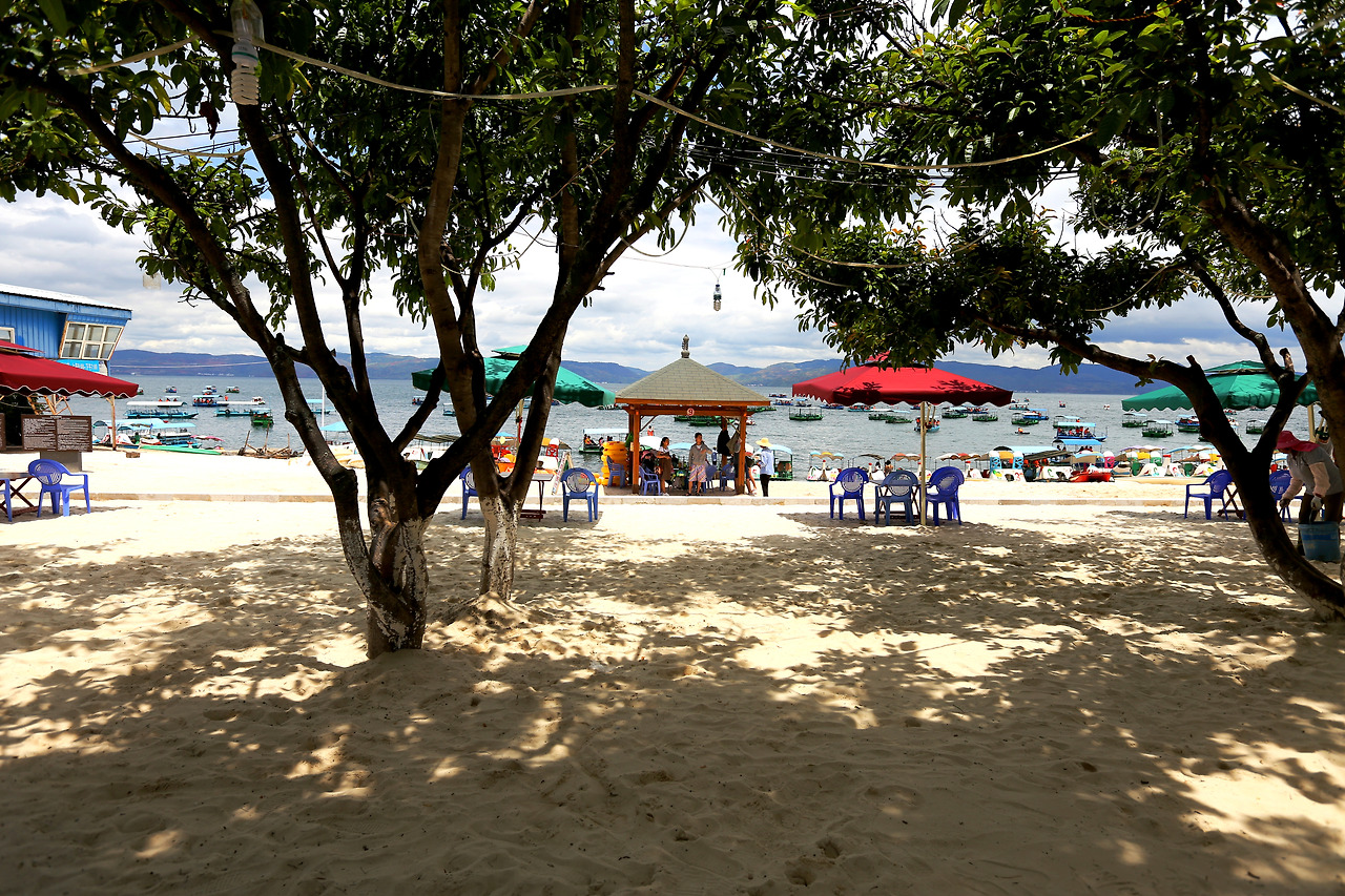 하지만 웬걸, 사람들이 많이 오는 루총 유원지로 들어서니 주차하는 우리들을 보자마자 우르르 호객을 하기 위해 사람들이 몰려온다. 밥을 먹으라고, 우리는 준비해온 도시락을 먹어야 하는데. 손님을 기다리는 호수에 떠 있는 유람선의 수도 대단하다. 가족단위로 물놀이를 하기 위해 들어오는 사람들을 바라보며 무선호의 새우와 생선을 팔고 있는 노점에 들어갔다. 음료와 간단한 메뉴를 시켰더니 고맙게도 우리가 준비해 간 김밥을 먹을 수 있도록 허락해준다.