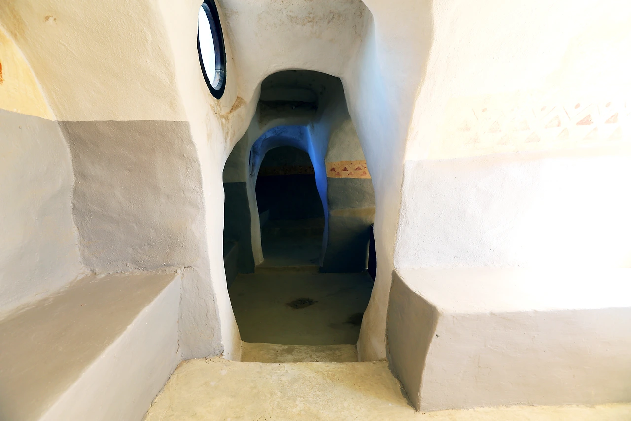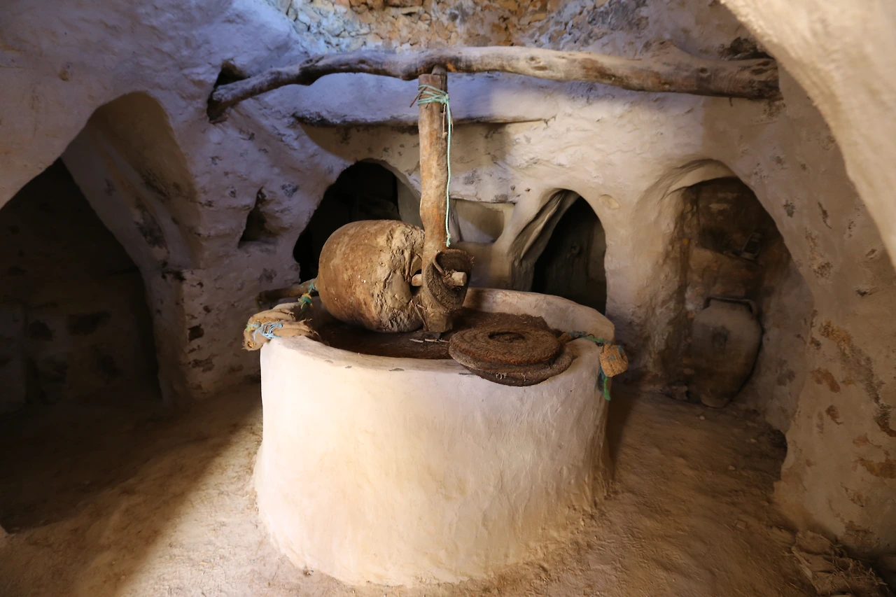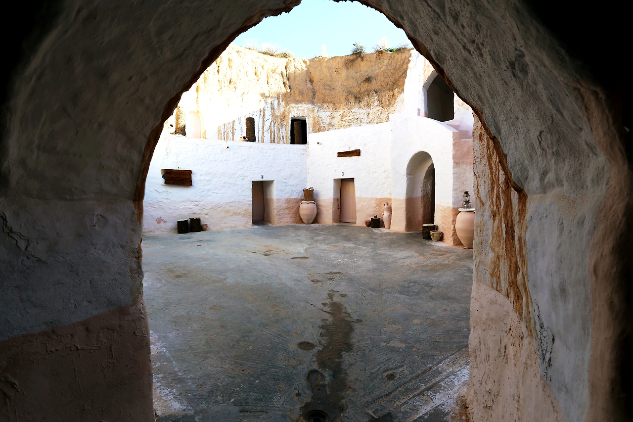 밖과 연결된 동굴식의 긴 입구는 현관이 되는데 현관과 연결된 곳은 거실의 형태로 파 들어간다. 둥근형태의 벽을 동굴 형태로 파서 방을 만들면 안방, 그 옆에 방을 만들면 아이들 방, 한 아이가 커서 장가를 가면 맞은편에 굴 하나를 다시 장만하면 신혼 방이 된다. 방들은 통로를 통해 서로 연결되기도 하고, 사람의 노고에 따라서 집은 얼마든지 큰 규모로 확장이 가능하다. 깊이에 따라서 2층과 3층까지도 나오는데 아래는 사람이 살고 위층은 주로 창고로 사용하고 있었다. 튀니지에 흔하디 흔한 올리브나무문을 만들어 달면 집 한 채 완성이다.
