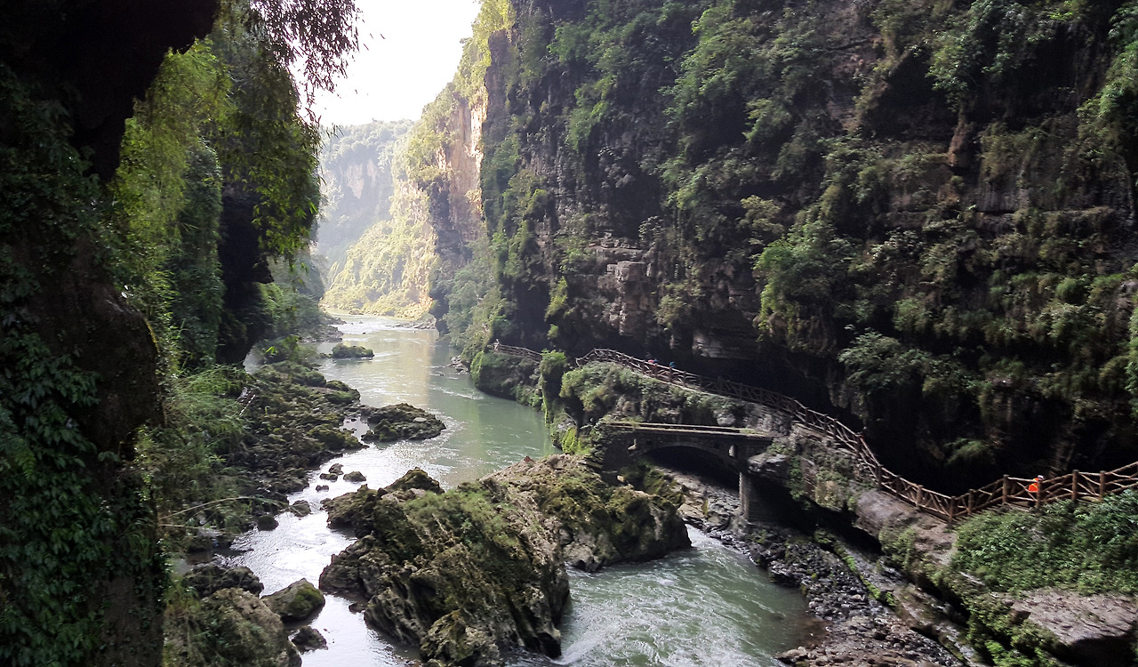 마링허馬嶺河 입장료는 80원, 왕복 엘리베이터 요금은 40원이다. 이전에는 협곡을 보려면 걸어서 한참 내려가야 했는데 근래에 74m의 엘리베이터가 개통이 되었다. 이른 아침이라 사람도 별로 없어 한적하고 서늘하다.