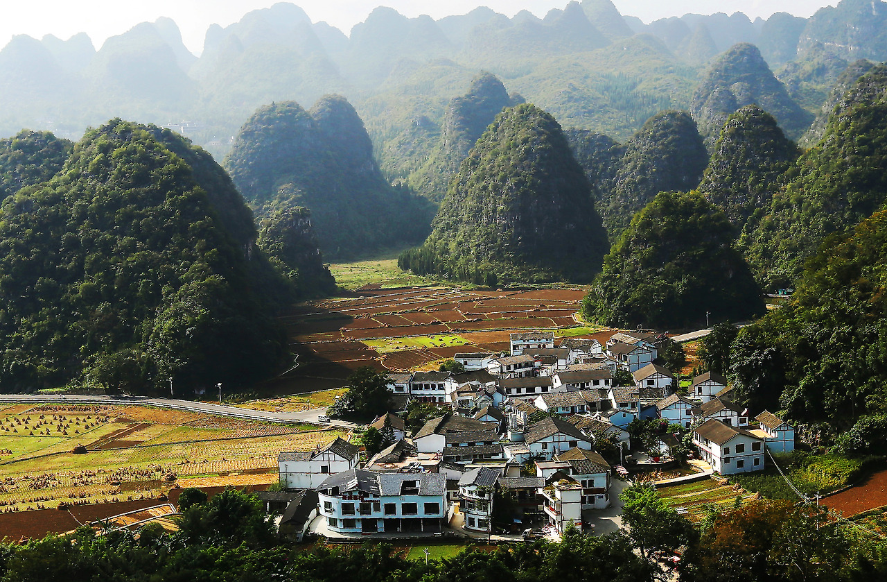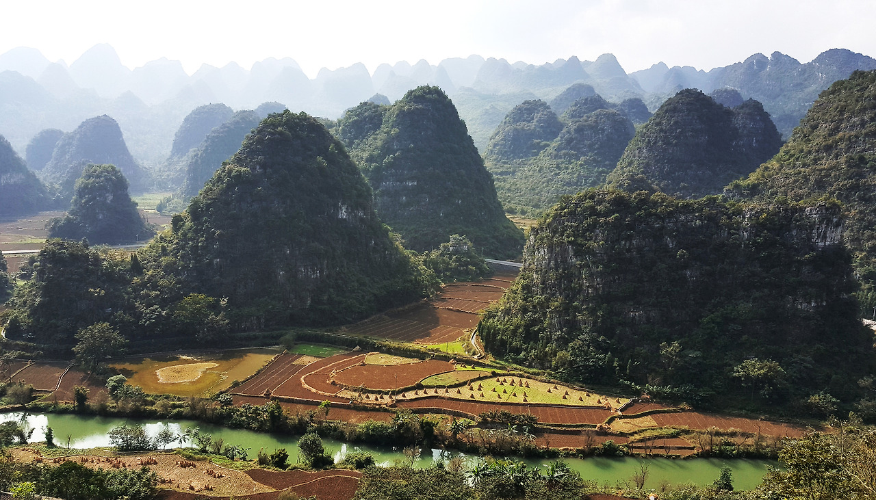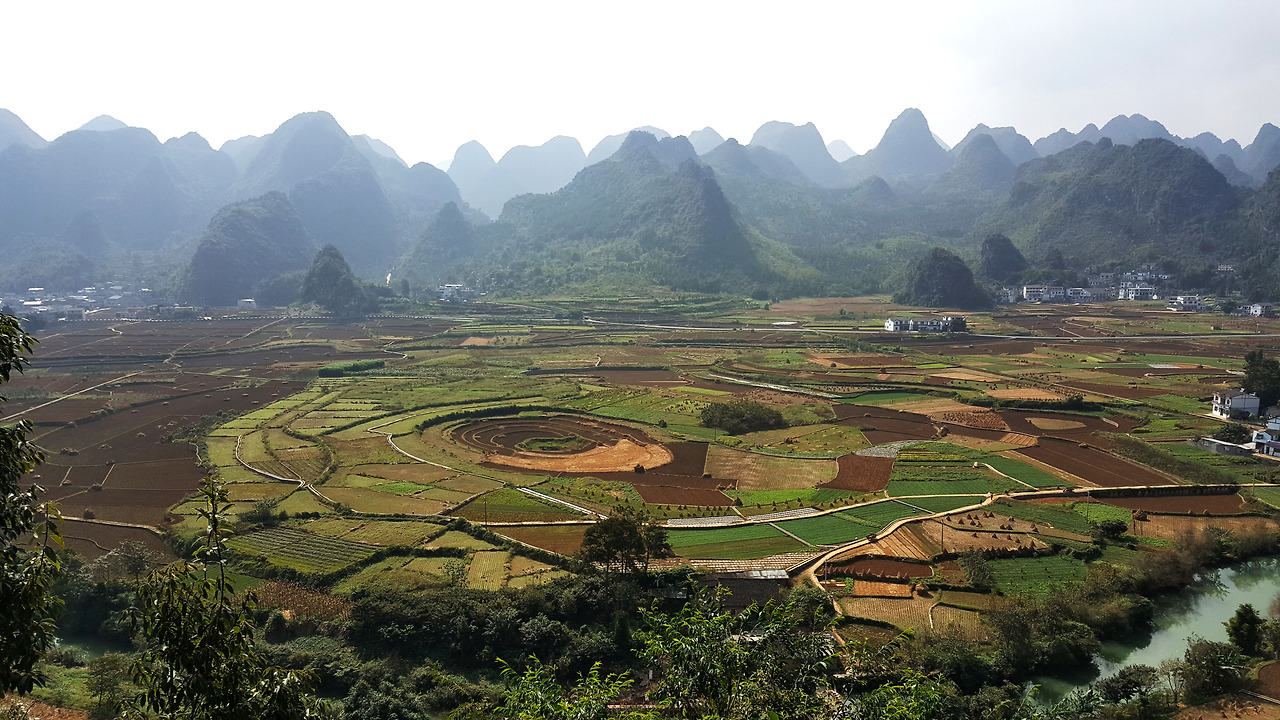 팔괘 전으로 유명한 밭은 카르스트 지형의 유년기에 형성되는 돌리네doline 지형이다. 서서히 지반이 약해지면서 가장 약한 곳부터 함몰된 곳으로 배수가 잘 되어 논보다는 밭으로 이용이 된다. 돌리네 아래로는 물길이 형성되어 있는 경우가 많다. 팔괘 전이 보이는 풍경은 탑 카르스트의 봉우리들이 병풍처럼 들판을 감싸고 있는 것이 광활하고 웅장한 느낌이 든다. 이 곳을 세 번이나 찾았던 명나라 사람 徐霞客Xu Xiake서하객의 자연을 가까이했던 안목이 부러워지는 순간이다. 완펑린 광장에는 이곳을 널리 알렸던 여행가이며 지리학자였던 그의 동상이 서 있다.