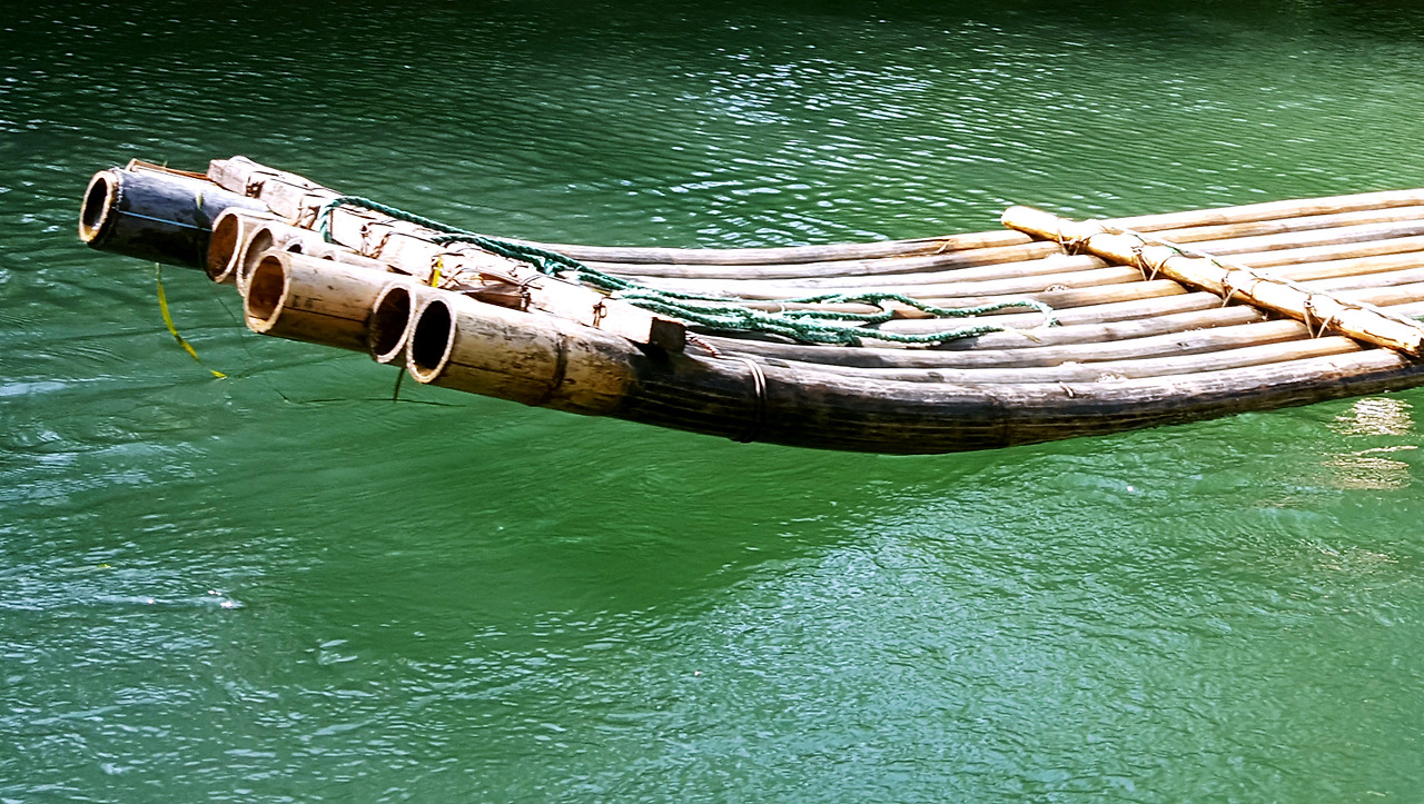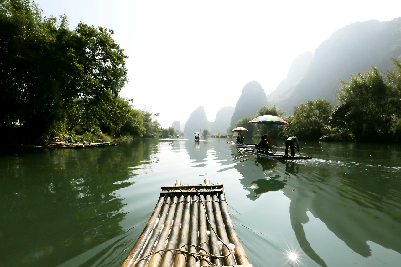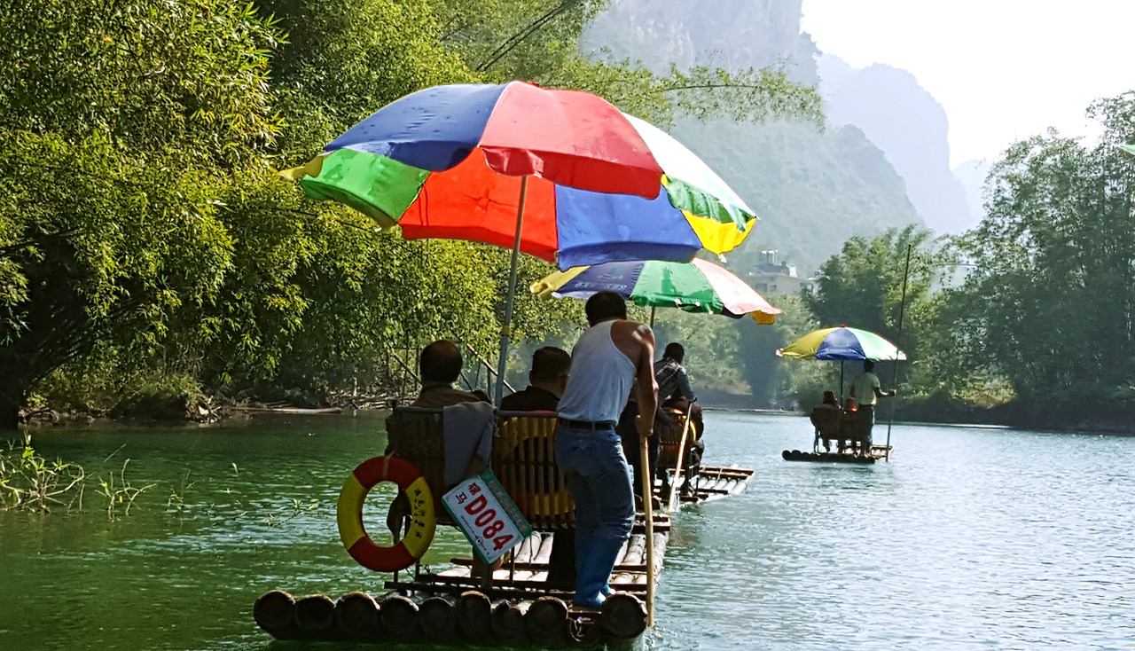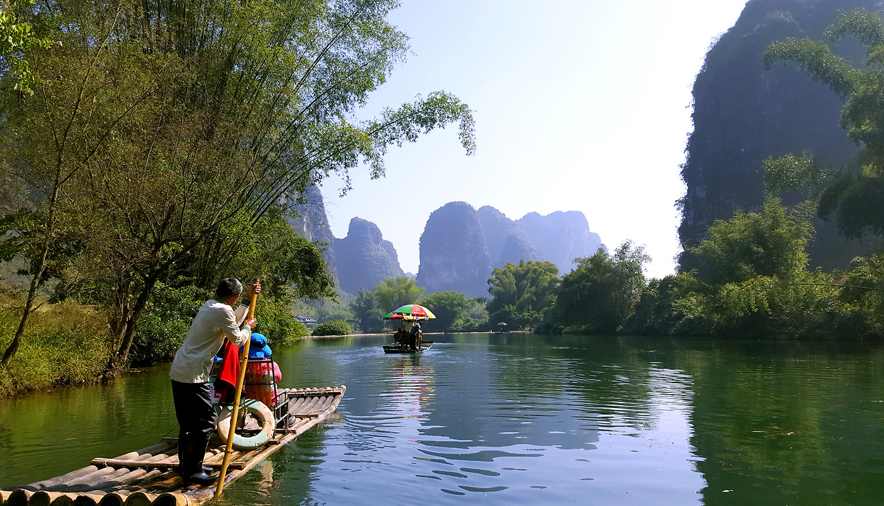 스키의 앞부분처럼 앞이 우아하게 올라간 긴 대나무를 엮은 뗏목에는 2인용 의자가 올라가고, 두 사람이 앉으면 뒤에서는 뱃사공이 장대로 바닥을 밀면서 1시간 30분가량을 간다. 이곳을 ‘십리화랑’이라고 한다더니 세상에서 볼 수 없을 것 같은 산수화 속을 하나 되어 지나간다.
