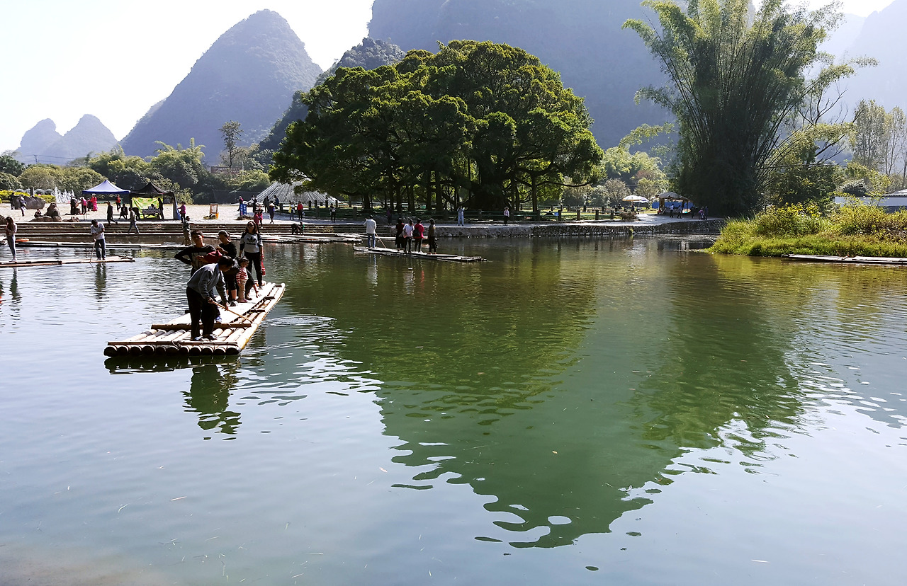 매표를 하면 배(배값도 따로 받는다.)를 타고 작은 내를 건너, 웅장해 보이기까지 하는 대용수 공원으로 들어간다. 용수榕樹는 보리수라고도 부르며 아열대지역에서 잘 자라는 나무이다. 1400세가량인 대용수은 광시广西좡족의 전설인 류산지에刘三姐와 그의 연인인 아뉴가 사랑을 나누던 곳이라고 한다. 얼핏 옆으로 뻗은 줄기의 무게를 받치기 위해서 놓은 나무처럼 보이지만, 줄기가 일직선으로 내려와 땅에 뿌리를 내리고 있다.