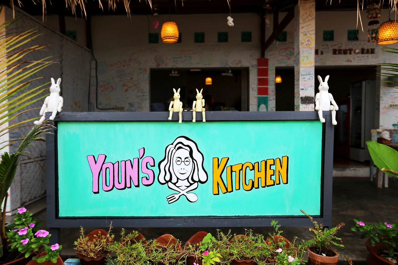 윤 식당 앞은 오전 시간에는 물고기가 많아 스노클링이나 물놀이를 즐기기에 적당한 곳이다. 맥주나 음료 하나 시키면 선 베드 하나 자리 잡고 놀 수 있다. 하지만 시간이 지나니 물이 쑥 빠져나가 바닥에 넓은 돌밭이 나타난다. 돌밭에서 놀 수 없어 밥을 시켰더니 정말 티브이 속 윤 식당 메뉴 하고 같은 메뉴를 판다. 영화 속 장소를 찾아가 체험하는 기분 같아 묘하다.