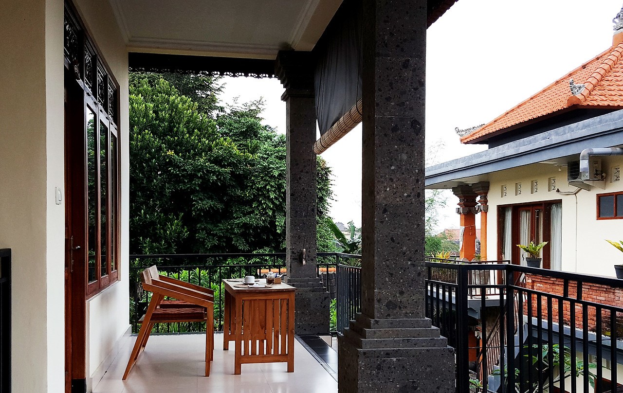 담장으로 둘러싸인 집안에는 여러 채의 단독 건물들이 정원을 따라서 이어진다. 아들이 결혼하면 울타리 안에 아들을 위한 집 한 채를 따로 지어서 여러 세대가 모여 사는 발리의 전통적인 집 형태이다. 베란다가 발달한 집의 형태는 개방적인 동시에 매우 개인적이다. 덕분에 방을 이용하는 손님은 매우 프라이빗하다. 2층 베란다는 마을 지붕이 보이는 전망으로 아래를 보면 정원이 보인다.