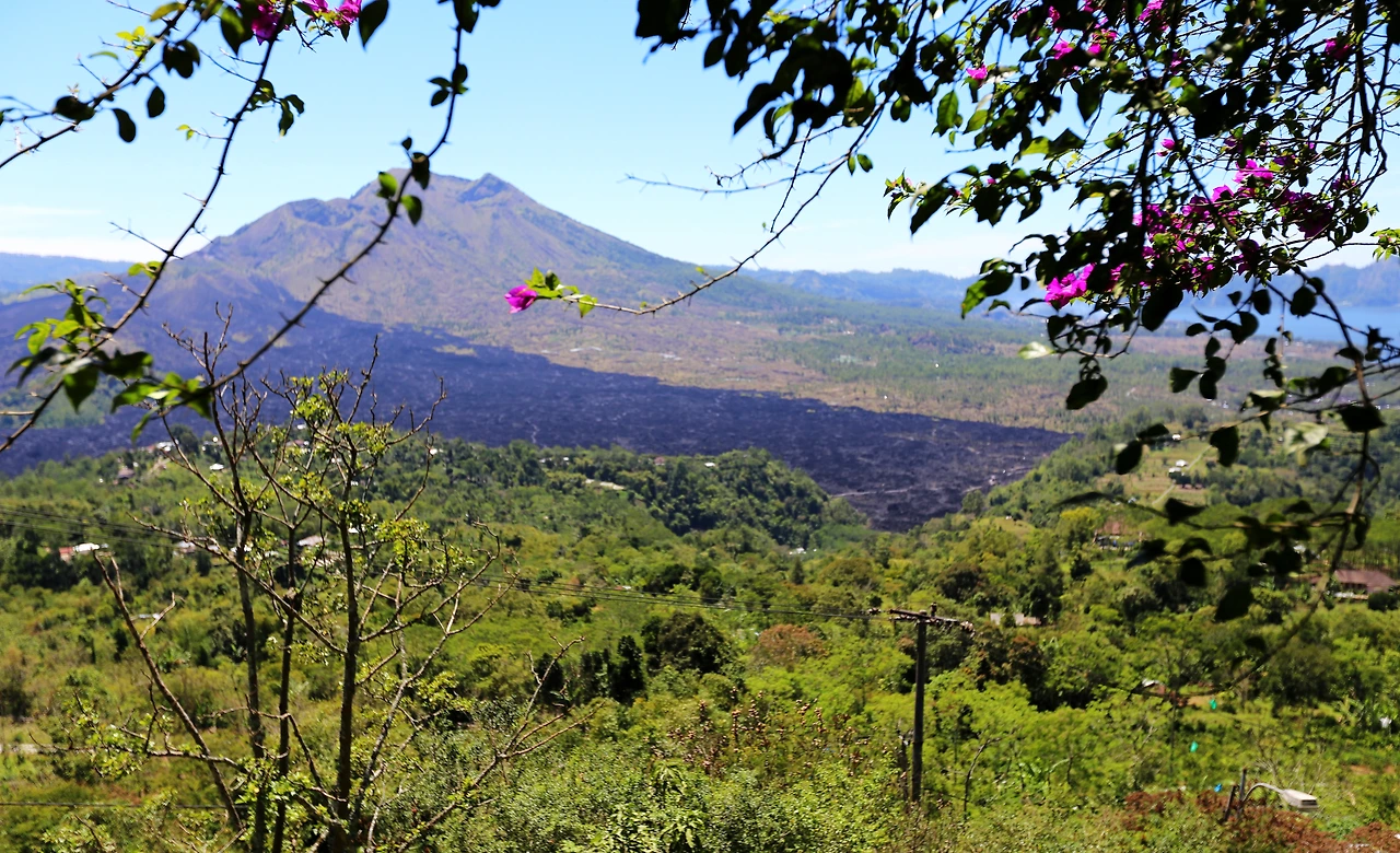 완만한 산기슭을 기분 좋을 만큼 달리면 눈앞에 파노라마가 펼쳐진다. 낀따마니 지역에서 바뚜르 산을 가장 잘 조망할 수 있는 Penerokan 마을이다. 바뚜르 화산 가장 최근의 폭발은 1968년이었다고 하는데 호수 쪽으로 흐른 완만한 능선에 짙은 회색 용암이 흘러내린 자국은 엊그제 흘러내린 것처럼 검정 물감을 부어 놓은 것 같다. 뷰가 좋은 레스토랑들이 있지만 어디든지 멋진 뷰는 감상할 수 있다.