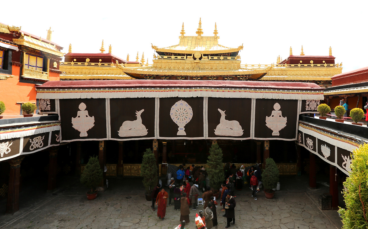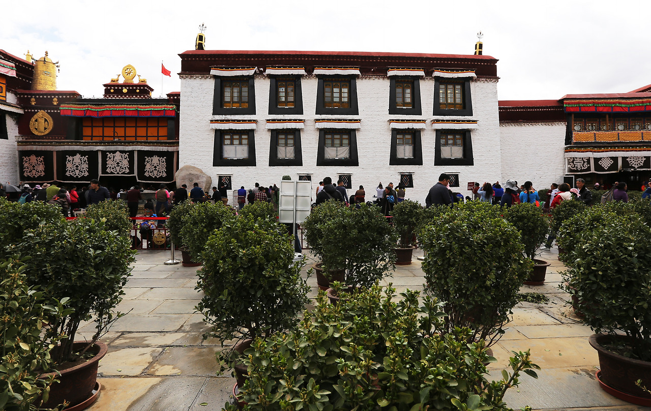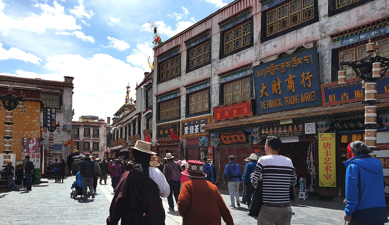 암도에서, 혹은 캄에서 왔을까, 걸어서 또는 오체투지를 하면서 많게는 수천 킬로미터까지 순례를 하는 사람들의 최종 목적지 중의 하나인 조캉 사원 앞에는 온종일 사원 앞에서 오체투지를 하는 사람들로 붐빈다. 군데군데 놓아둔 화분이 오체투지를 하는 분들을 다른 사람들의 시선으로부터 보호를 해준다. 그늘이 있는 곳에 자리를 잡지 못하고 햇빛을 받으며 오체투지를 하는 사람을 보니, 커다란 나무라도 곳곳에 심어놓으면 좋겠다. 사이사이에는 9세기에 당과 토번 사이에 맺은 ‘우호를 유지하며 서로 침범하지 말자’는 약속이 새겨진 회맹 비 등 여러 비석들이 이곳이 역사적인 곳이라는 것을 말해준다. 이곳은 포탈라궁과 함께 전통한복을 멋지게 차려입고 사진을 찍는 선남선녀들을 쉽게 만날 수 있는 곳이기도 하다. 우리나라의 전통한복도 멋지고 예쁘지만 티베트 전통복식은 우리 것보다 화려함이 더하다.