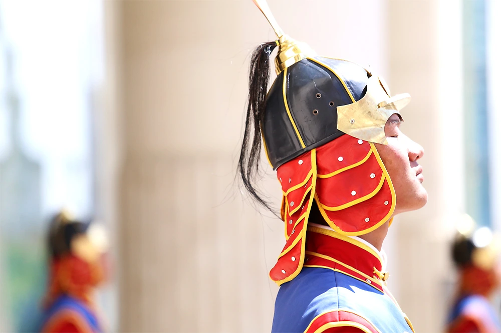 징기즈 칸 주위에서 서성이다가 지하에 있는 국회 뮤지엄을 보고 나오니 11시 30분경 빨강과 파랑의 대비가 돋보이는 클래식한 제복을 입은 많은 숫자의 군인들이 북소리 같은 리듬에 맞춰 움직이고 있었다. 여느 나라의 왕궁 앞에서 치르는 교대식이 아닌 꽤나 비장하고 진지한 의식이다. 진지한 중에도 옆에서 사진을 찍도록 흔쾌히 응해주는 미소를 머금은 청년의 시선은 고원의 청명한 공기처럼 신선하기까지 했다.