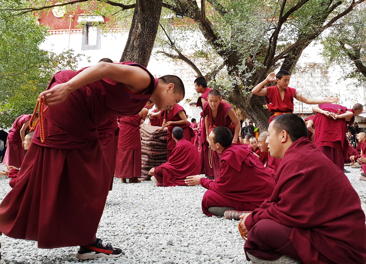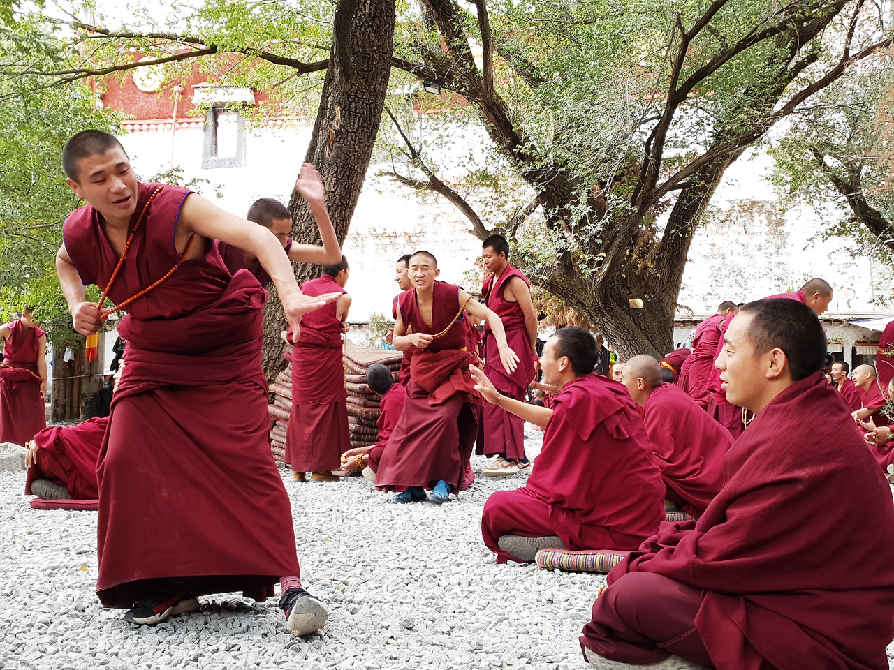 티베트 불교 수업에는 토론형식을 차용한 교리문답 Chora 수업이 있다. 질문자는 다양한 주제를 질문할 수 있지만 답변자는 4가지 답변(그렇다, 왜 그런가, 논거가 성립되지 않는다. 필연 관계가 없다)만 가능하다고 한다. 학승들의 수는 줄었지만 Debating Courtyard라고 붙어있는 뜰에서 매일 오후 3시에서 5시까지 100여 명에 가까운 학승들의 교리문답이 이어진다. 질문자가 발을 구르고 왼손으로 쥔 염주를 아래에 놓고 오른손을 올리는가 하면, 손바닥을 힘차게 쳐 올리고 하는 동작들은 춤과도 같다. 가끔 시무룩한 표정도 짓지만 질문자 못지않게 답변하는 자도 만만치가 않다. 제대로 된 답변이 나왔는지 파안대소하는 학승도 있다. 열띤 에너지가 살아 숨 쉬는 떠들썩한 정원의 모습은 티베트 불교가 강력하게 살아있는 증거이다. 나는 어떤 주제를 가지고 이처럼 토론하고 결론을 얻는 수업을 한 번이라도 받아본 적이 있는가 싶다.