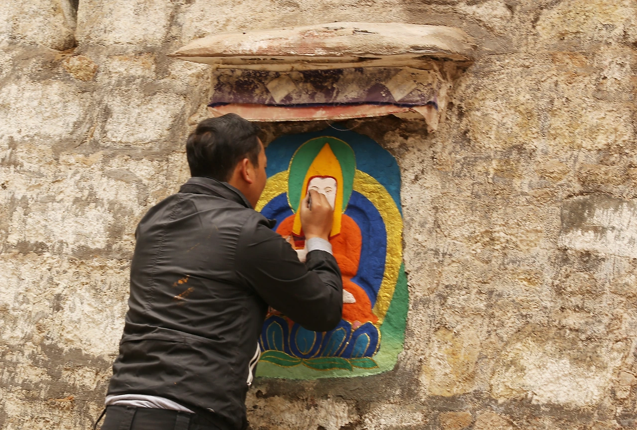 세라사원은 탕카도, 불상도 유난히 많다. Debating Courtyard에서 나오는 길, 벽화를 그리는 화공, 총카파를 그리는 듯