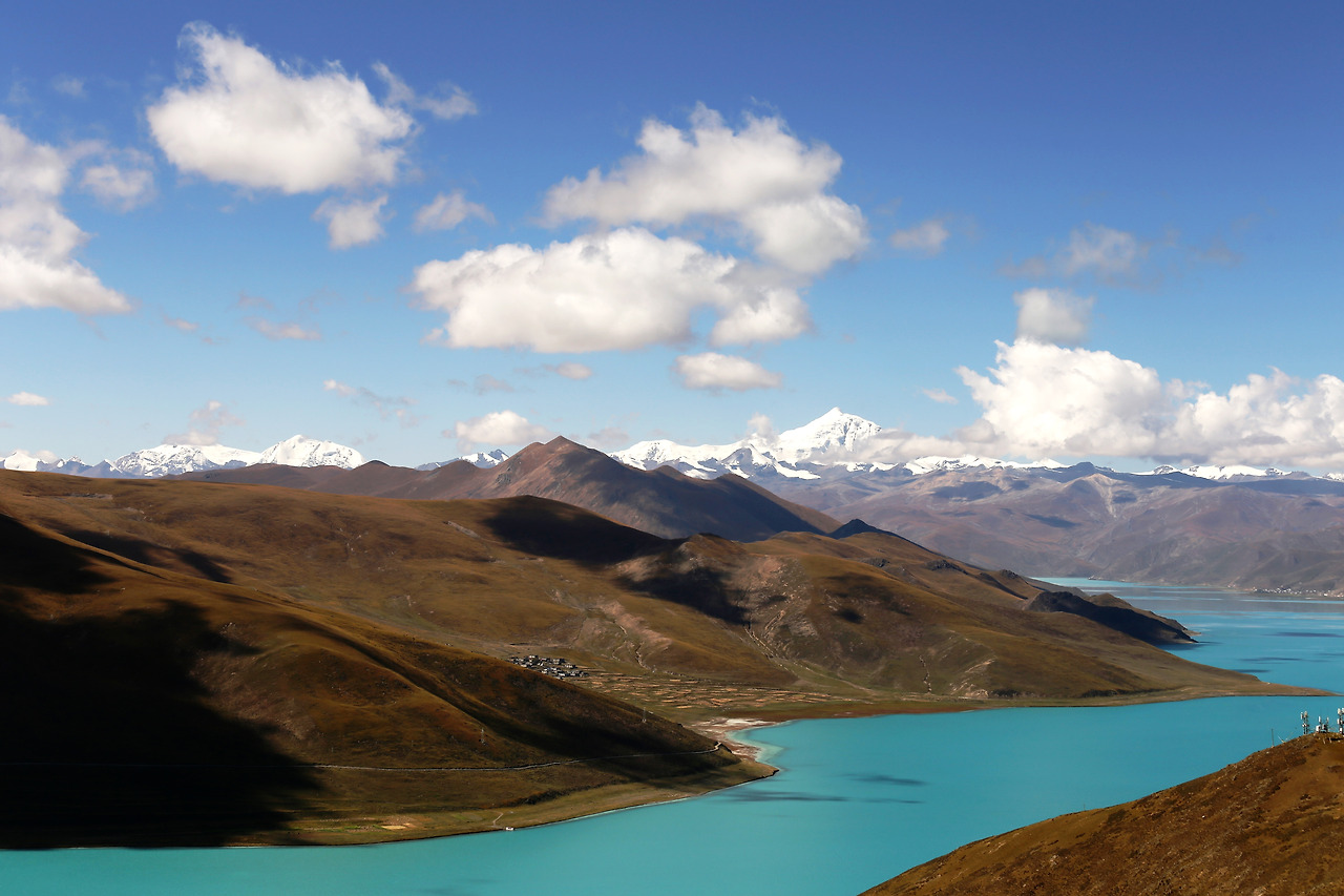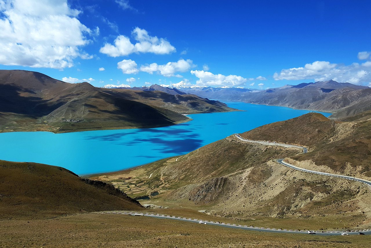 라싸에서 취수이(곡수)현을 지나 2시간 여 약 4,900미터에 가까운 캄파라Kamba la 고개에 접어들기 시작하면 고도가 꽤 높게 느껴진다. 압도하는 풍경이 눈앞에 나타나지만 혹여 고산증세라도 올까 봐 조심스럽다. 하지만 전망대 역할을 하는 고개 정상에서 또렷하게 파노라마처럼 펼쳐진 얌드록쵸Yamdrok Tso(4,480미터)를 보는 순간은 할 말을 잊는다. 기상에 따라 호수의 상징인 터키석 푸른색 호수를 못 볼 수도 있다고 했지만 내 눈을 단숨에 사로잡은 호수의 아름다운 색깔은 심장을 멎게 하고, 설산을 뒤로하고 정지해 있는 듯 여신의 미소를 닮은 turquoise 푸른색은 역시 얌드록쵸의 백미이다. 게다가 호수 주변을 둘러싼 설산들이라니, 호수를 바라보다 보면 나도 모르게 호수 뒤 오른쪽 삼각형의 예쁜 설산 노진 캉짱산Noijin Kangsang(7,179미터)에 눈이 멎어 있다.