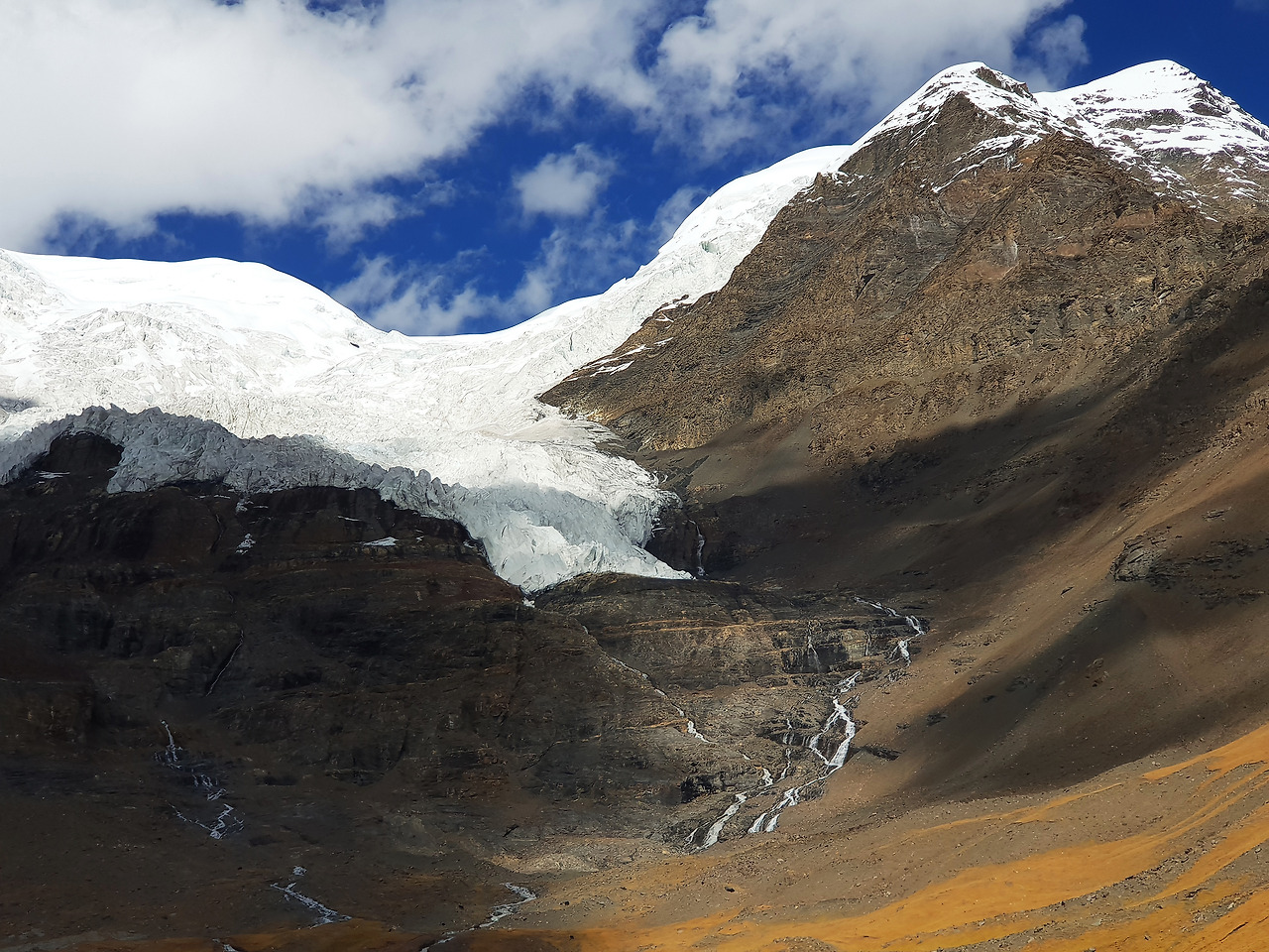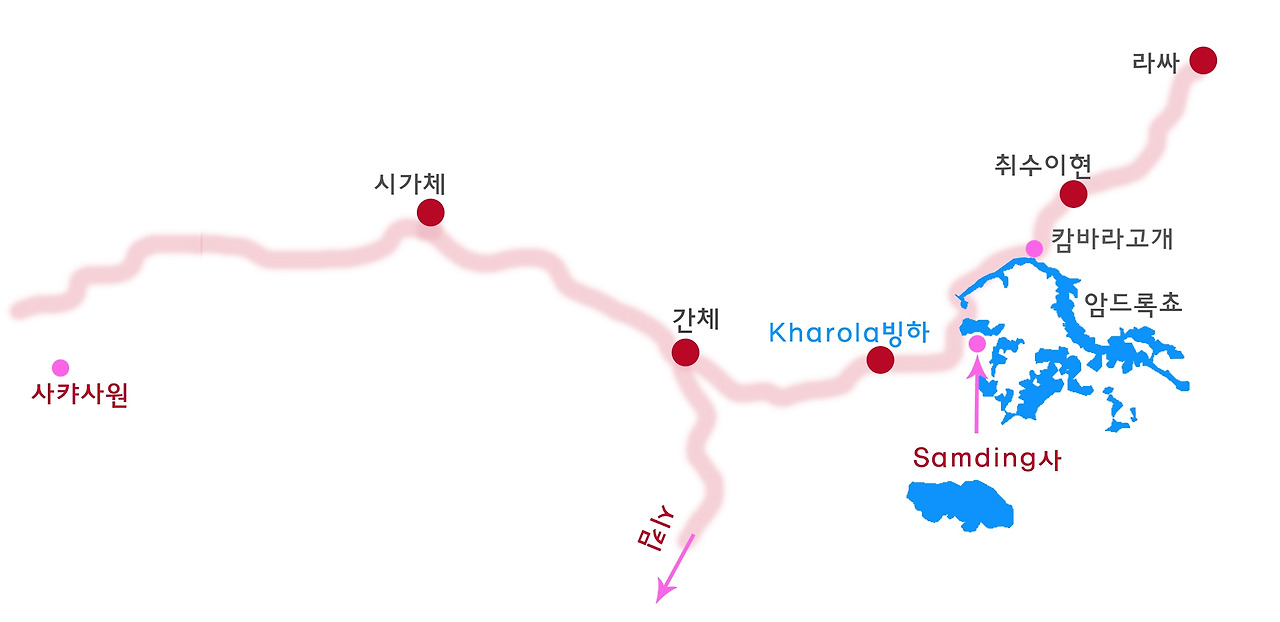 얌드록쵸를 지나 서쪽으로 1시간 30분 정도 6,000미터가 넘는 고산준봉들 사이를 지나다 보면 오른쪽으로 Noijin Kangsang Peak아래 카로라Kharola 빙하(5,560미터)가 나타난다. 높은 산 밑동 바로 위에 걸려있는 순백의 빙하는 바로 눈앞에 있어 더 경이롭다. 빙하가 녹은 물은 물줄기를 이루어 흘러내린다. 최근 카로라 빙하가 녹는 속도라면 2035년이면 빙하 전체가 없어질 거라는 이야기에는 마음이 답답할 뿐이다.