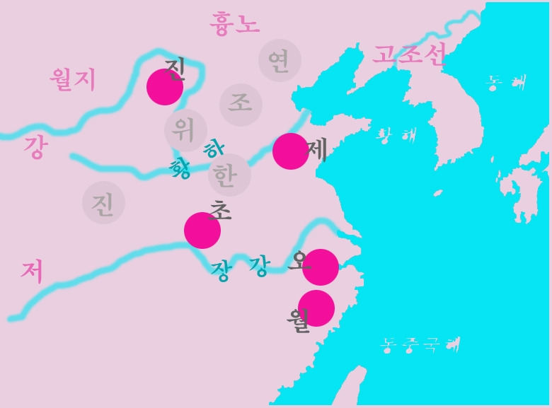 춘추시대(기원전 770~453)의 지도, 붉은 색 동그라미는 춘추오패이다.