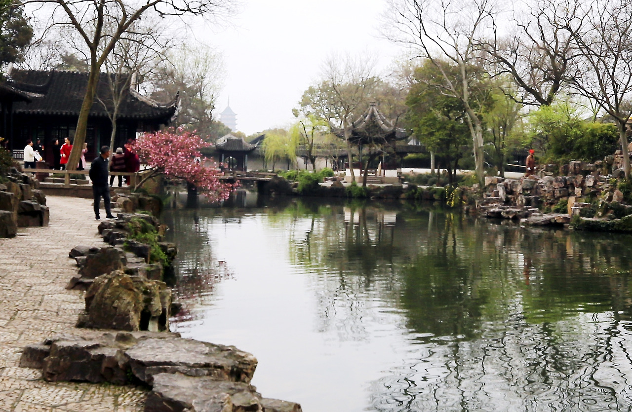 졸정원 중원의 연못을 중심으로 건물들이 배치가 되어 있다. 멀리 희미하게 보이는 탑은 쑤저우의 랜드마크인 북사탑이다.