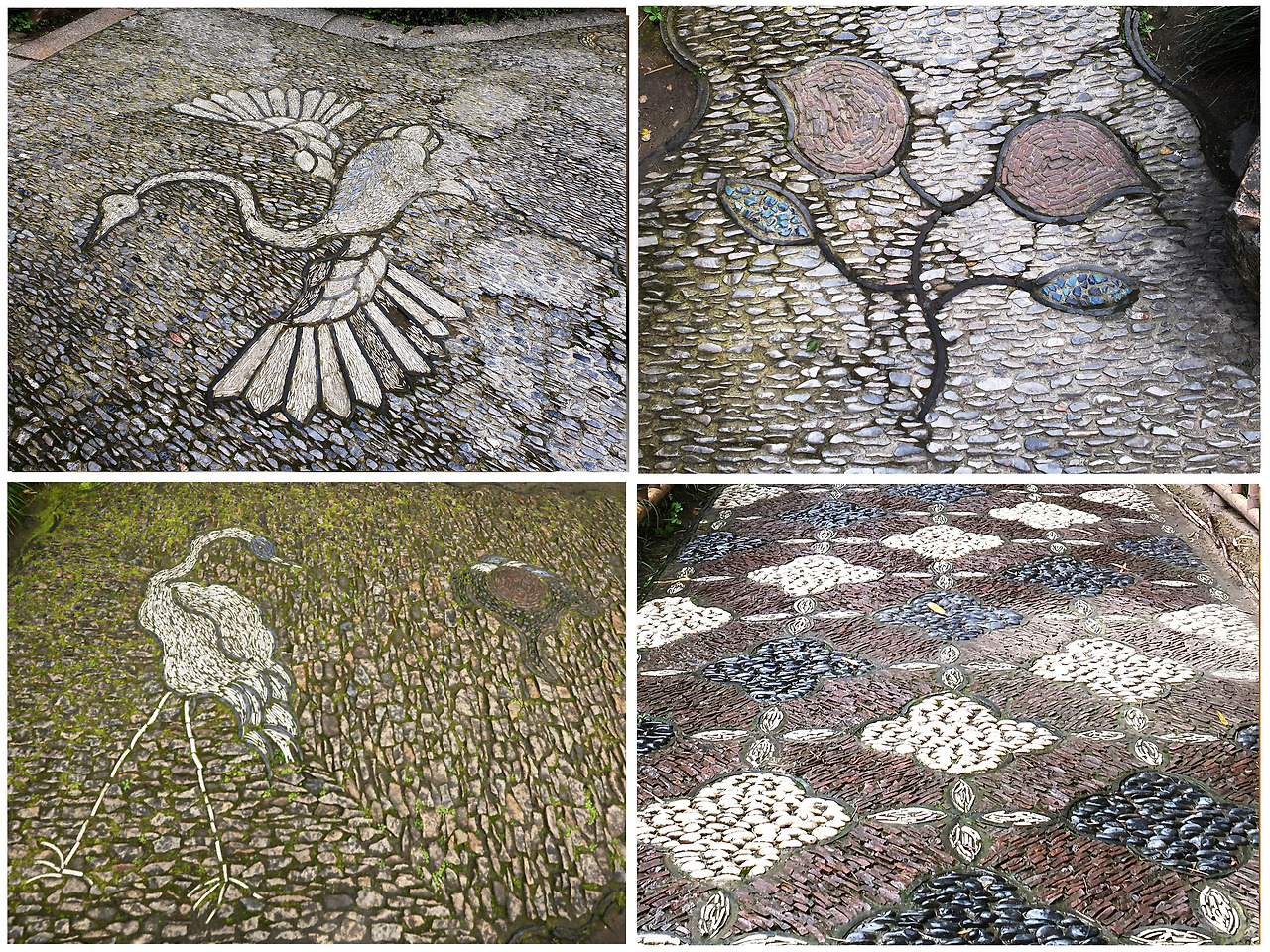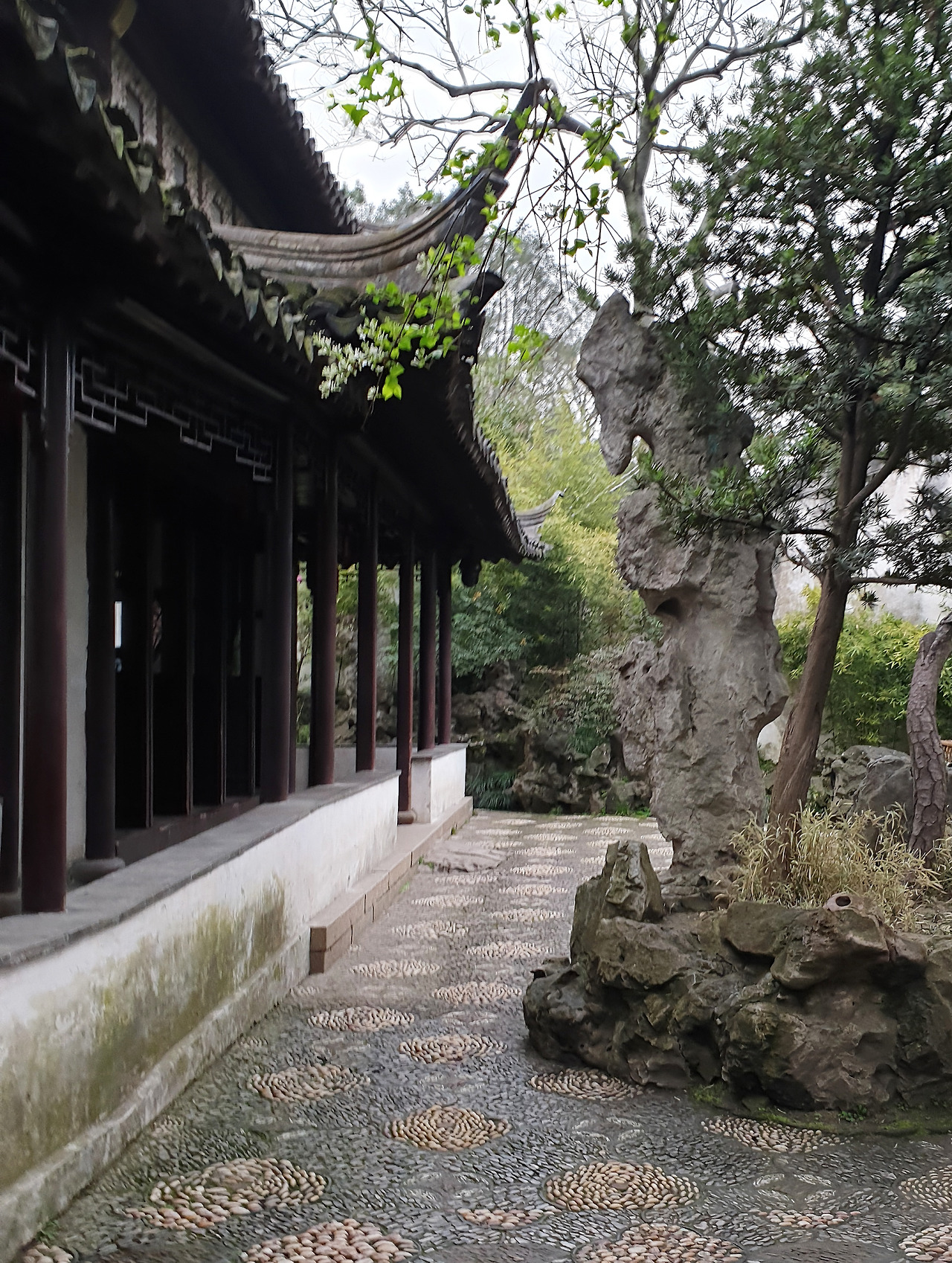 관람객들이 빠르게 빠져나가는 오후 5시가 훌쩍 넘은 시간, 분재가 있는 분경원을 지나 西園에 도달했을 때는 비가 내리기 시작했다. 가산을 중심으로 조성된 西園은 자연스럽게 식재된 수목들과 어우러져 자연에 가깝게 느껴질 정도로 호젓하고(서원을 관람할 때는 비가 왔으므로 관람객이 거의 없었다) 낭만적이며 떠나기 싫을 만큼 다정하다. 졸정원拙政園에서도 볼 수 있었던 예쁜 색깔의 조약돌(때론 도기나 벽돌)로 수를 놓은 것처럼 꾸며놓은 오솔길은 나로 하여금 땅까지 확인하면서 걷게 한다. 원림 전체에 깔린 돌 문양은 어느 한 곳도 중복된 이미지가 없다.