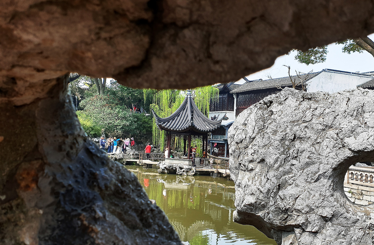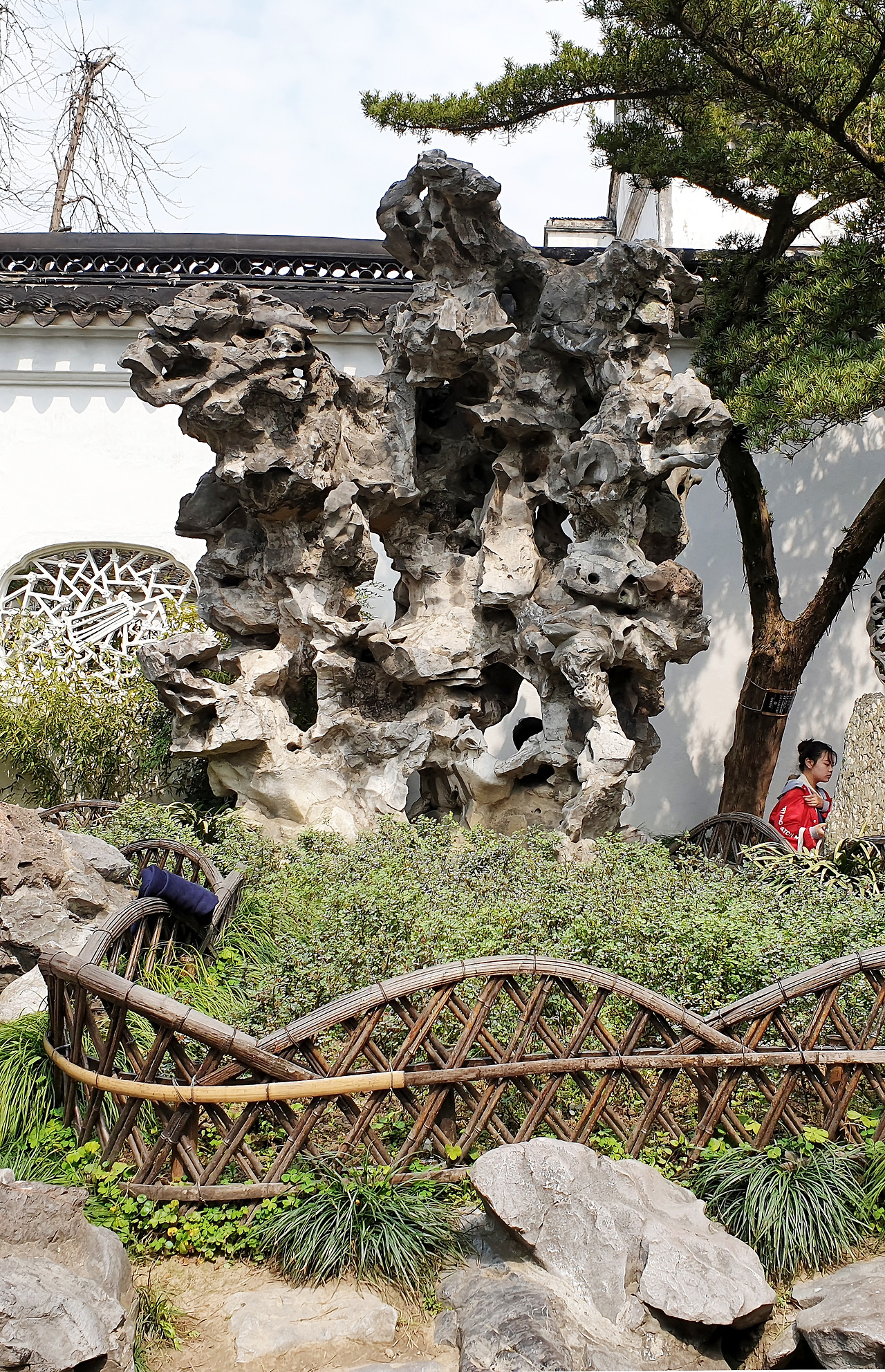 연못가에 조성된 가산에는 튀어나온 것이 사람인지 태호석인지 분간을 못할 정도다. 울긋불긋한 것들이 움직이니 사람으로 인식할 뿐이다. 가산에는 여러 갈래의 길이 있어 한 번 들어가면 많은 이들이 쉽게 돌아 나오지 못한다고 한다. 너무나 많은 사람들로 인해 연못을 한 바퀴 도는 것도 쉽지가 않다. 튀어나온 태호석의 갈기에 머리라도 부딪칠까 조심조심 가산 사이로 난 길을 따라가다가 오는 사람에 막혀 다시 돌아오기를 반복했다. 태호석에 뚫린 수많은 구멍은 지나가는 사람들로 막혀 차경을 감상하는데 방해가 되기도 한다.
