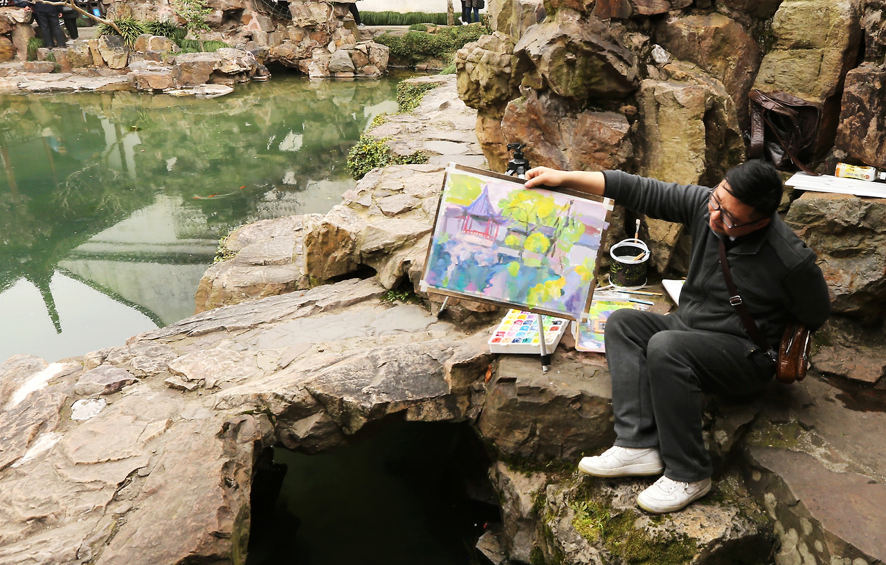 탁영수각 옆에서 그림을 그리던 남자, 중국에서는 야외에서 그림그리는 모습을 자주 목격한다. 봄날의 이미지를 색깔을 통해 나타내었다.