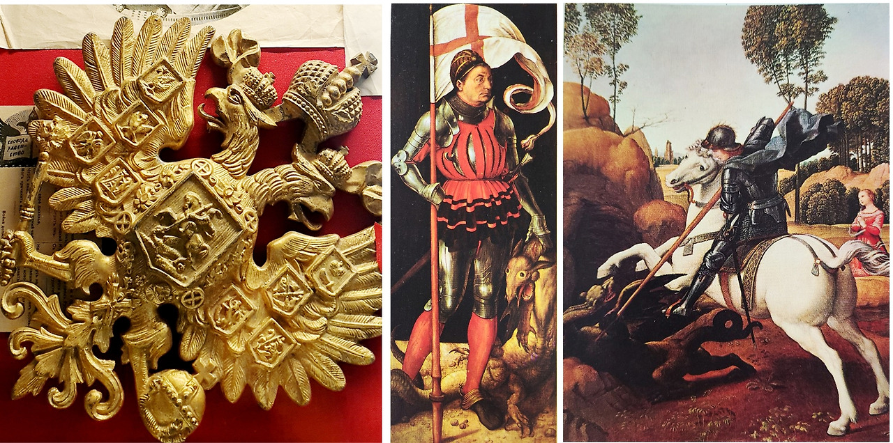 성 게오르기가 있는 러시아 문장(왼쪽)과 성 게오르기 십자가를 들고 있는 성 게오르기(뒤러 작)와 라파엘이 그린 성 게오르기