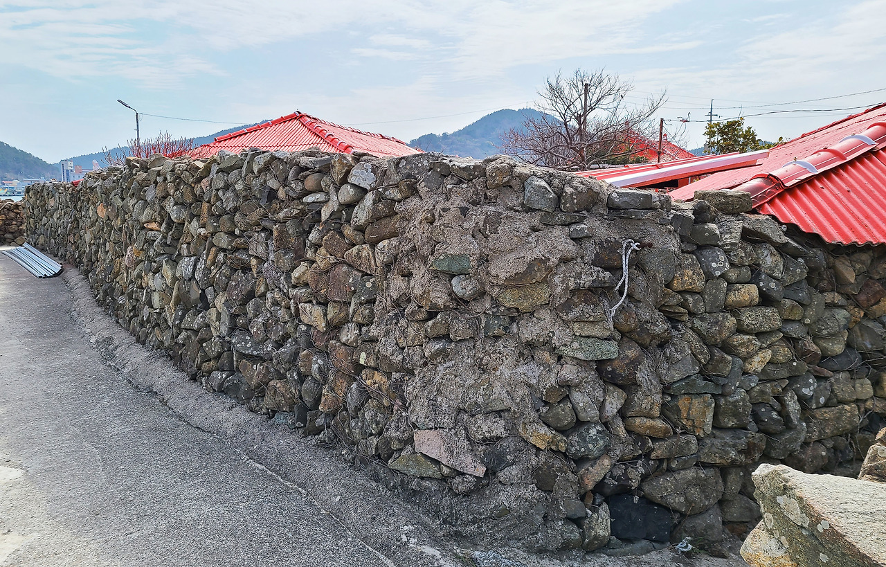 바닷가 마을, 이렇게 지붕이 담장 아래 몸을 낮춘 풍경은 이곳이 갑이다.