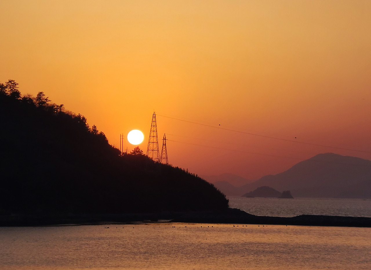 오후 5시가 좀 넘은 시간, 여객선 터미널 앞에서 방을 찾았다. 꽤 큰 호텔임에도 방이 없다고 하면서 다른 호텔도 쉽지 않은 거라고 하신다. 알고 보니 내일은 근처에 있는 나로우주센터에서 중요한 행사가 있는 날이었다. 다행히도 두 번째 찾아간 여객선터미널 앞에 있는 나로 호텔에는 우리를 위한 방이 하나 남아있었다. 4층 방에 올라가니 건너편 지근거리에 있는 쑥 섬에서 해가 떨어진다. 고흥 8경의 하나라던 쑥 섬 낙조 풍경이다.