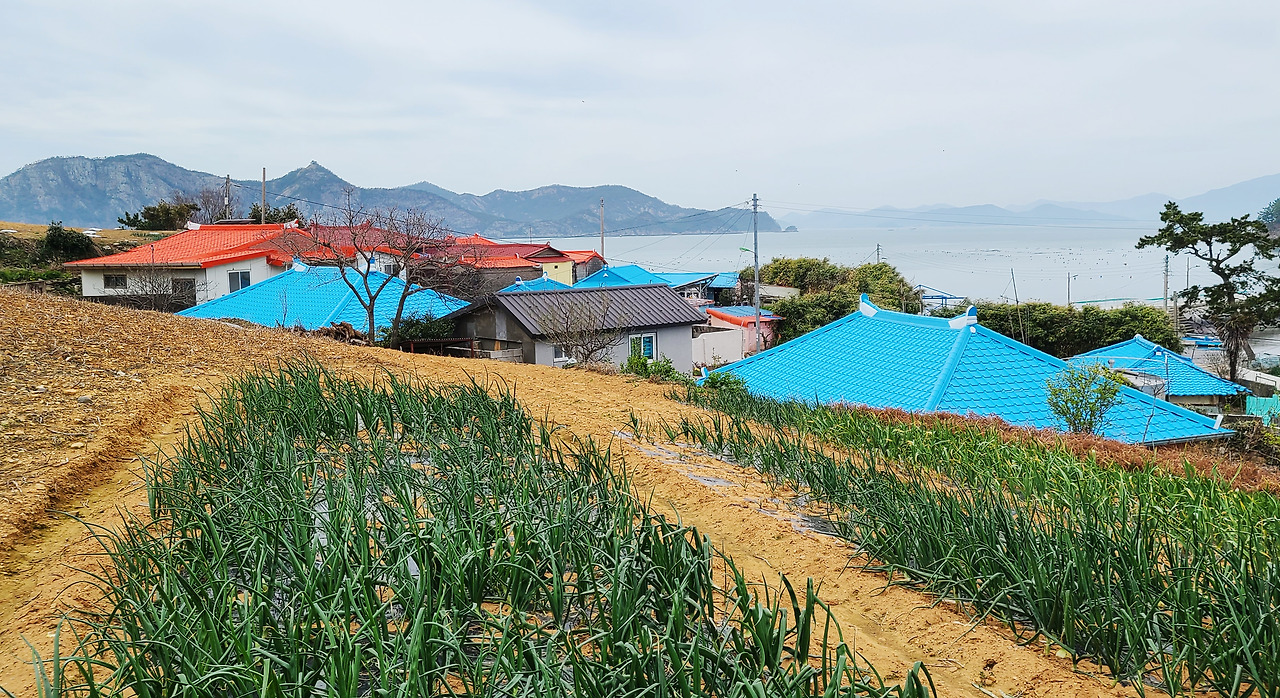 세월의 이끼를 품은 회색 빛 담장 위로 솟아오른 다홍색과 파란색 지붕은 텃밭의 농작물과 함께 생동감이 넘친다. 뒤로 보이는 금당도의 멋진 실루엣은 마을을 돋보이게 해 주는 배경이다.