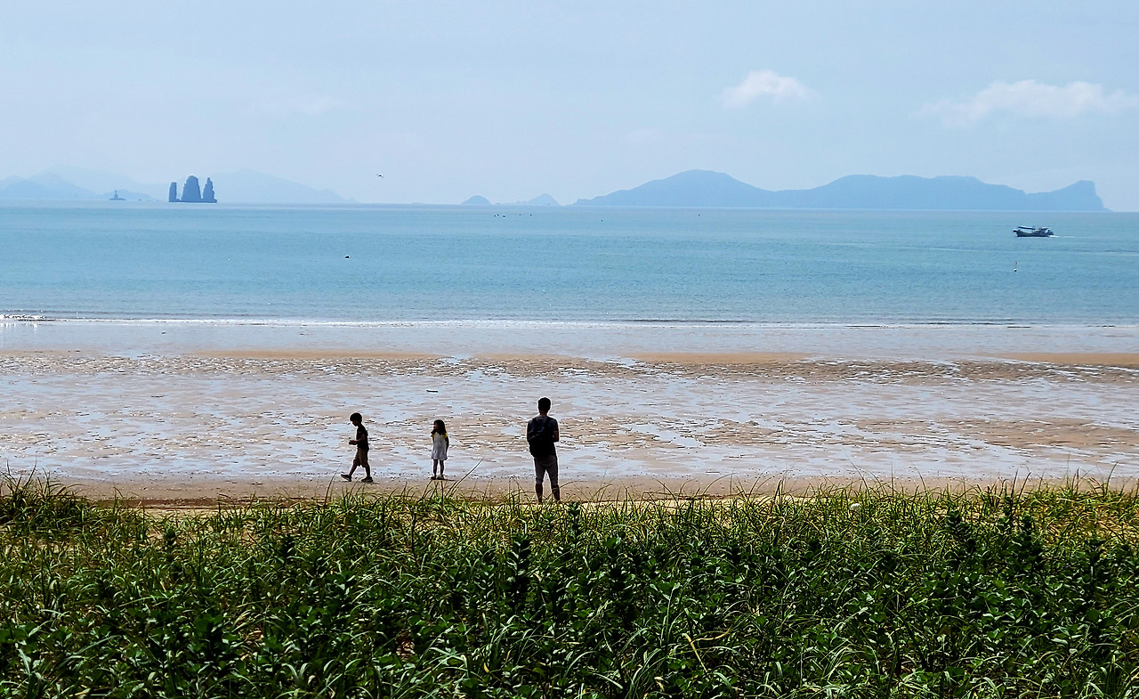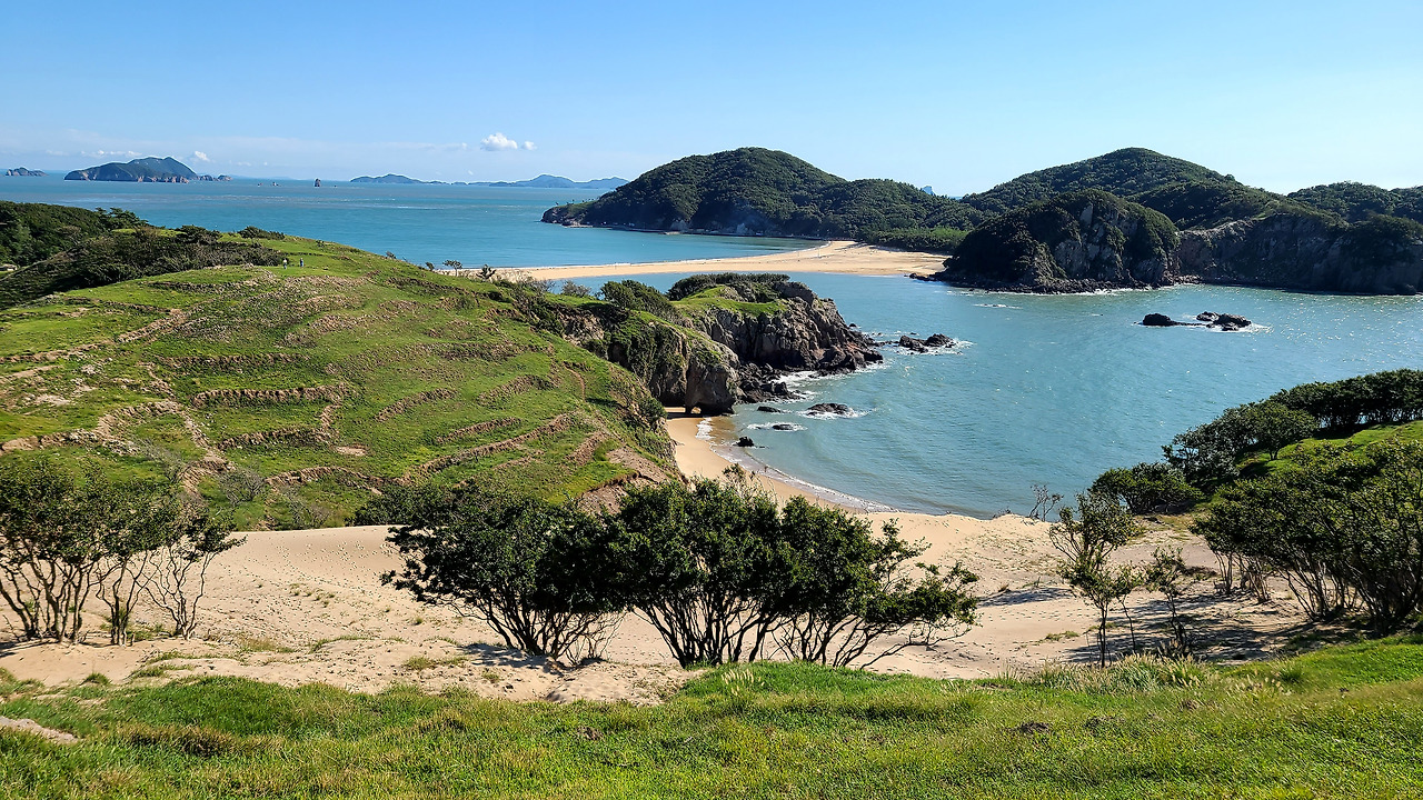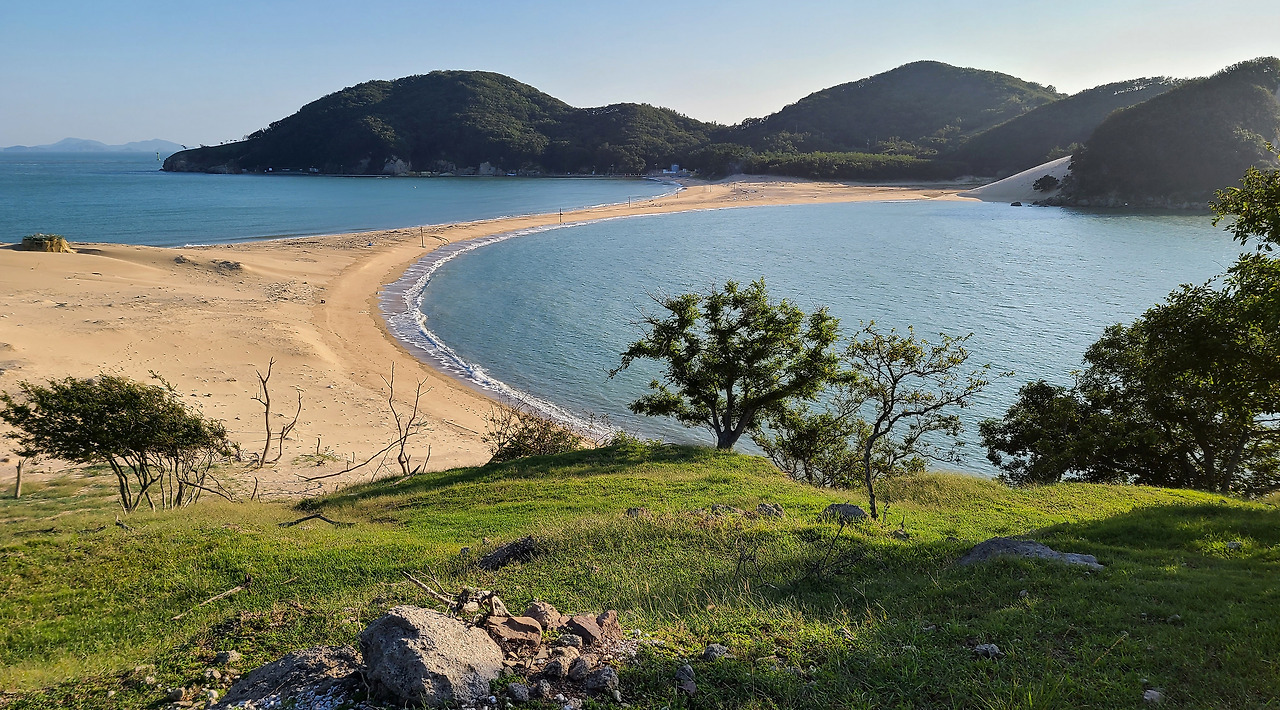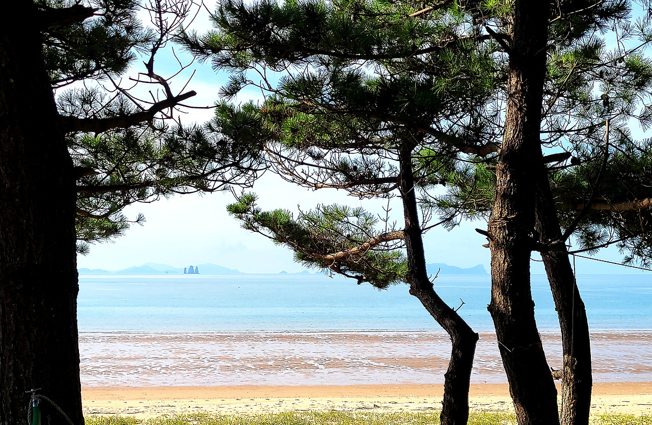 아침에 일어나니 토끼섬에서 개머리 언덕으로 오르는 둔덕까지 한눈에 펼쳐진, 길이 약 400m가 넘는 해변이 지평선이 보이는 김제평야처럼 평화롭다. 멀리 선단여는 세 그루의 나무처럼 보인다. 밤새 파도소리 한 번 인식하지 못하고 잠을 푹 잘 수 있었던 것은 날씨의 덕이지만 완만하게 깊게 들어와 있는 약 300m에 달하는 해변의 폭 때문이기도 하다. 마을의 뒤쪽으로는 숲이 우거진 산이 서쪽 바람을 막아주고 앞으로는 경사가 낮고 깊은 해빈이 방파제 역할을 하는 이곳에 마을이 있는 것은 당연하다.