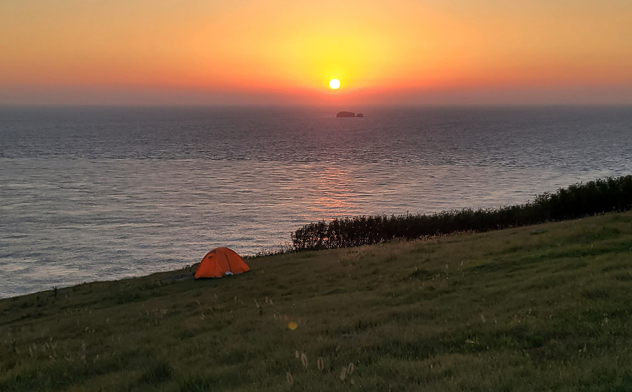 9월 초, 굴업도의 서쪽하늘에서는 6시 30분경 일몰이 시작되었다. 일몰은 어디에서나 만날 수 있는 흔하디 흔한 풍경이지만 언제나 다른 옷을 입고 나타난다. 산들바람에 움직이던 언덕 위에 가득한 수크령의 속삭임마저도 멈춰있는 듯, 날이 맑아서였을까, 마치 한지에 물감이 스며들 듯, 텅 빈 세상은 오렌지 빛으로 위에서 아래로 물들어간다. 느다시뿌리라고 부르는 개머리 언덕의 끝자락, 그것도 일몰 시각에 서쪽의 바다를 바라보고 있으면 둘이 있어도 마치 혼자인 것처럼, 세상의 끝에 있는 느낌을 받는다.