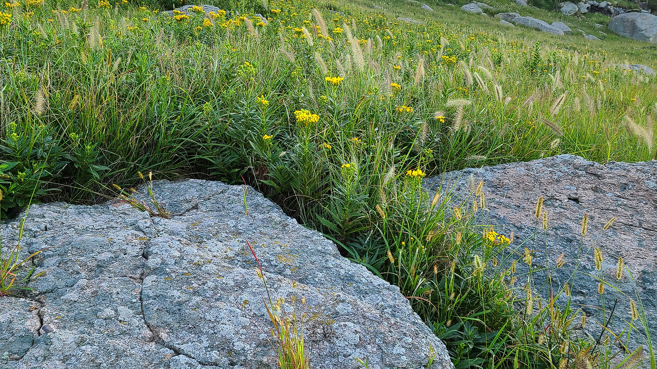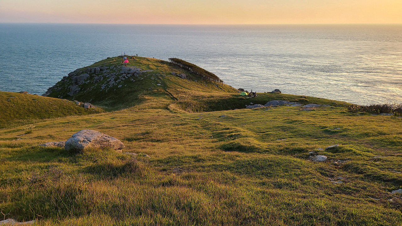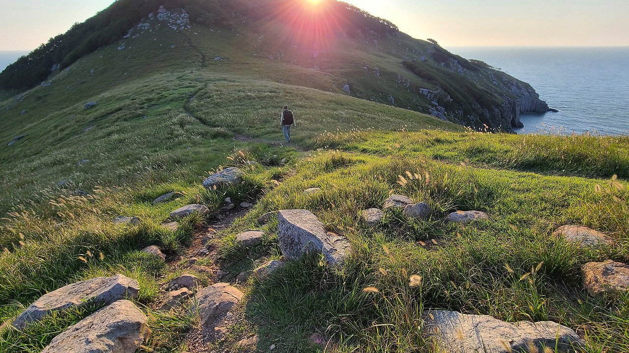 그동안 비가 많이 왔었지, 소사나무 숲 사이로 작은 계곡물이 흐르고 붉은색 도둑 개들도 산길을 오른다. 소사나무 숲만 벗어나면 금강아지풀(수크령)이 반겨주는 능선을 오른다. 지는 햇살에 반짝이는 수크령의 산들산들한 움직임에 가슴이 벅차오른다. 열이면 열 모두가 환호하는 개머리 언덕의 풍광은 한국의 산야에서는 경험하기 힘든 개방감 때문일 수도 있겠다. 수크령 사이사이 노란 금방망이꽃이 반겨준다. 조금 일찍 올라올 걸, 기다려주지 않는 일몰 때문에 금방망이꽃을 자세히 바라보지 못하고 지나쳐야 했다. 목기미 해변에서 개머리 언덕까지 약 1시간 정도 걸렸다.