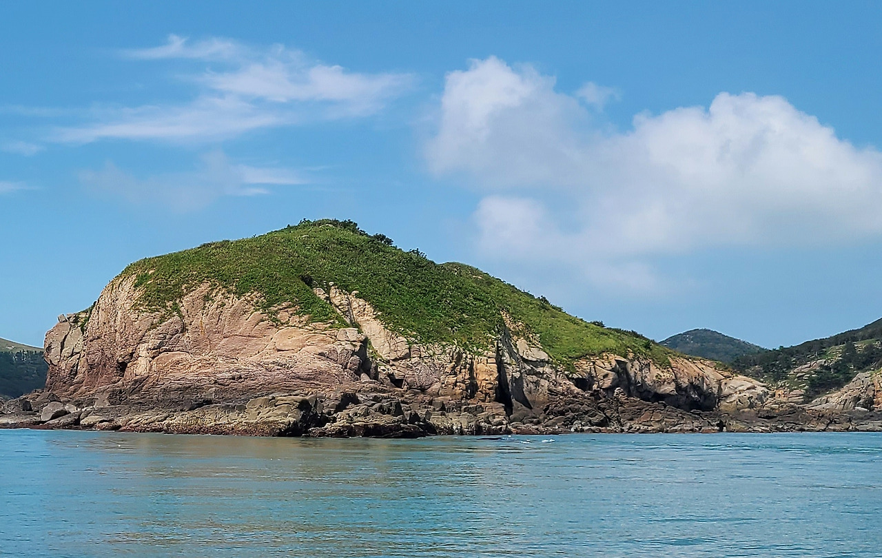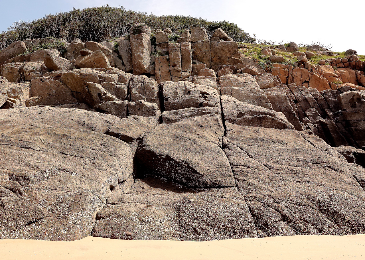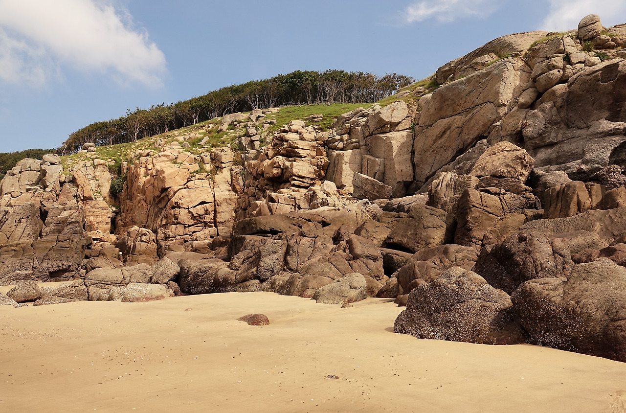 코끼리 바위에 다녀와서 토끼섬을 바라보니 물이 적당히 빠져 들어갈 수 있겠다. 12시 20분경 나가는 배를 타야 해서 얼른 다녀와야 했다. 큰말 해변을 가로질러 가는 길 해안선은 갈수록 붉은색을 띤다. 왼쪽으로 난 절벽에는 분명하게 달라 보이는 세 가지의 암석 군이 이어진다. 덩치가 크고 색깔이 진하며 거칠어 보이는 맨 아래의 암석은 집괴암이며 그 위에는 밝은 색 응회암이 올라가 있다. 응회암은 수직의 절리가 발달되어 있으며, 확실하지는 않지만 화강반암으로 추측되는 붉은 암석은 곧 풍화되어 내려앉을 것처럼 잔주름이 많다. 그 해변이 붉기 때문이다.