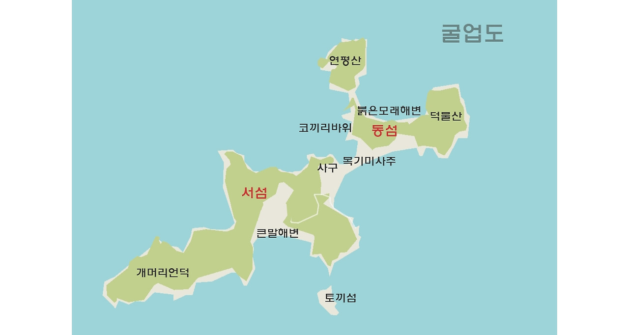 곶의 형태를 한 동 섬의 양 끝에는 덕물산(138m)과 연평산(128m)이 솟아있다. 그 사이에 쑥 들어와 있는 해식애와 함께 있는 붉은 모래 해변이 아름답다. 파식과 퇴적 활동을 이렇게 적나라하게 보여주는 곳이 있을까. 시간이 지날수록 절벽과 해변은 뒤로 더 물러날 앉을 것이다. 붉은 해변 뒤로는 둥근 습지가 남아있다. 습지 옆에는 마을에서 사용하는 우물이 있었다고 한다.