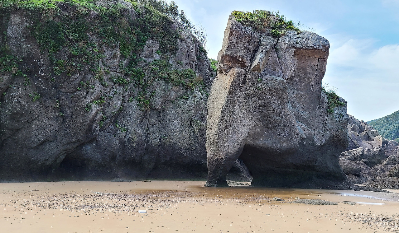 왼쪽으로 보이는 아침의 토끼 섬은 아직도 물에 잠겨있다. 11시경에는 물이 빠져 섬으로 들어갈 수 있을 거라고 민박 집 아주머니께서 말씀하신다. 차려주는 아침을 먹고 어제 밀물로 인해 가까이 가지 못한 코끼리 바위로 향했다. 주인아저씨는 벌써 트랙터를 몰고 해변으로 나가고 계신다. 물이 적당히 빠진 목기미 해변 맞은편 석호가 있는 해변에는 다양한 연흔이 선명하다. 코끼리 바위는 한 마리의 잘생긴 코끼리가 문을 열고 나와 절벽 앞에 서 있는 모습이다. 바위는 해안 절벽에서 툭 하고 잘라져 나온 모습으로 시아치(sea arch)까지 포함한 시 스택(sea stack)이다. 부드러운 응회암이기 때문에 파식이 빨리 진행되는 듯 보였다.