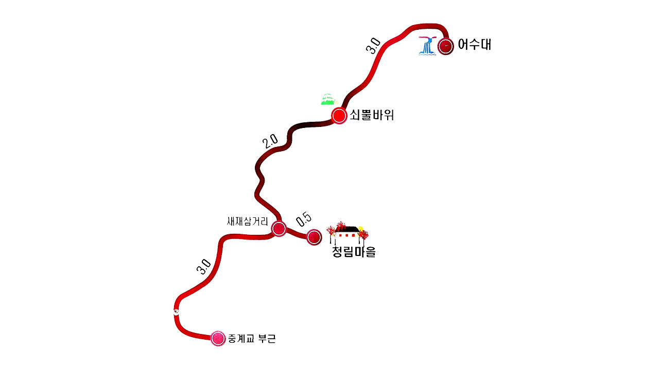 청림마을에서 주차를 한 유동 쉼터까지는 약 4km로 도보로는 약 30분에서 40분 거리이다. 버스 정류장에 붙어있는 시간표를 보는 둥 마는 둥 하면서 두리번거리는데, 마침 지나가는 트럭 한 대가 멈춰 선다. “유동 쉼터까지 가는 버스가 언제 오나요?” 물었더니 왜 그러냐고 묻는다. “그곳에 주차를 하고 산행을 했거든요.” 하니 “허허, 거기가 우리 집이요, 타세요!” 하면서 선뜻 문을 열어준다.
