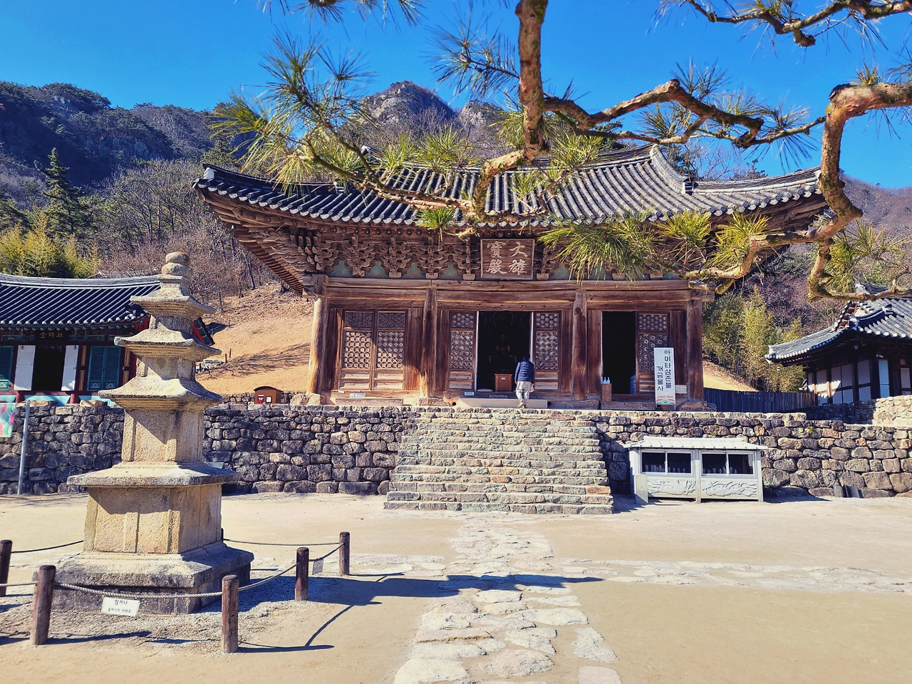 봉래루를 통과하면 보이는 풍경이다. 대웅보전이란 현판은 원교 이광사의 글씨