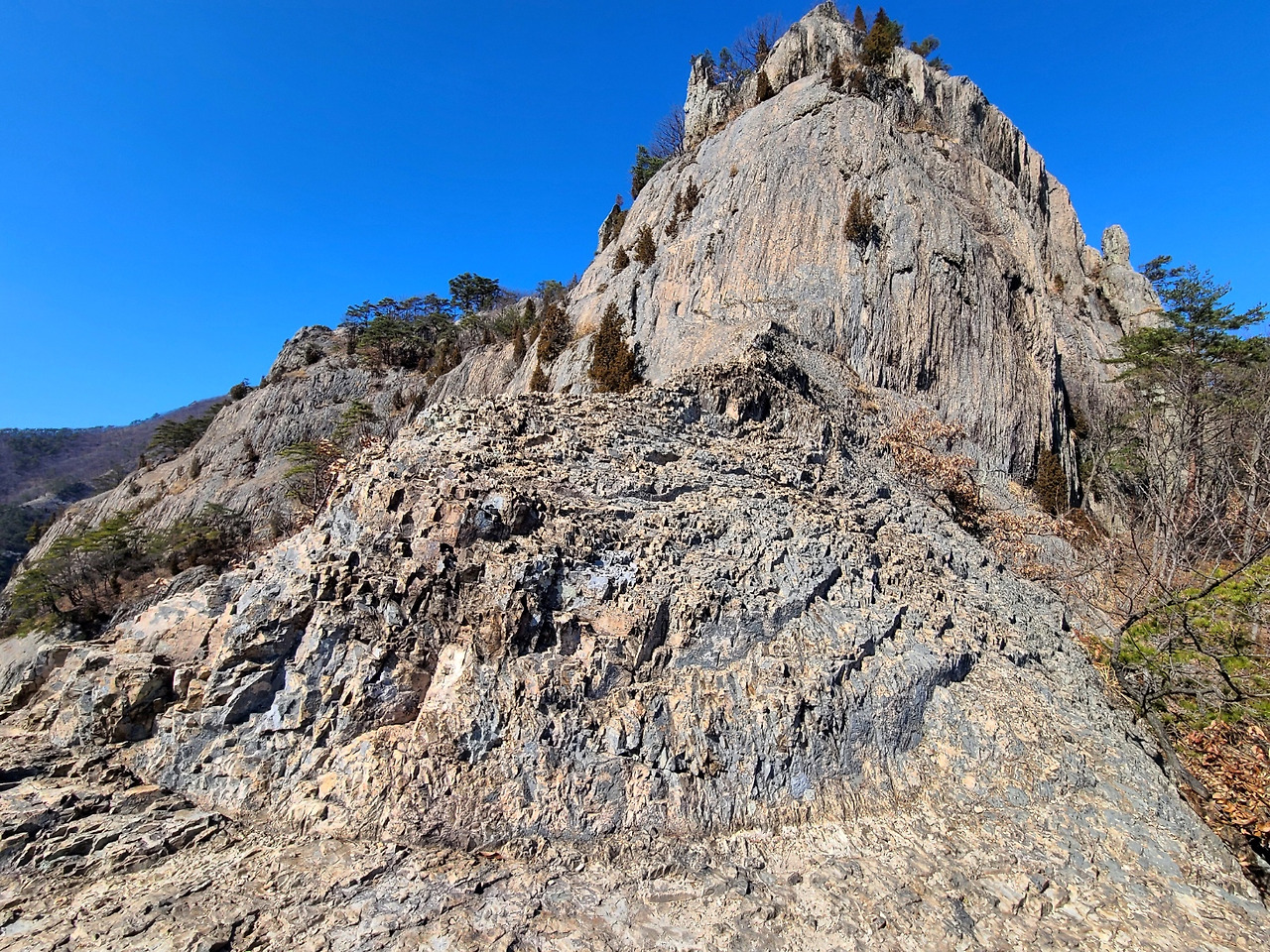 유동 쉼터 오른쪽 길로 나오면 어수대 방향 이정표가 서 있다. 어수대는 부안댐 발원지라고 한다. 이정표를 따라가다 보면 쇠뿔봉으로 오르는 들머리가 나온다. 들머리 앞쪽으로 한 무리의 등반객이 산을 오른다. 반가웠다. 산을 오를 때 앞서거니 뒤서거니 하는 사람들이 있으면 안심이 된다. 정확한 루트로 가고 있는지 굳이 확인을 안 해도 되기 때문이다. 어쨌거나 평일에 등반하는 사람들이 있는 것을 보면 역시 이곳은 국립공원이다. 국립공원답게 안내표시도 잘 되어 있다. 코스가 단순하여 길을 잃을 염려는 없지만, 본능적으로 앞서가는 날렵한 등반객들을 놓치지 않으려고 하니 평소보다 속도가 빨라진다. 10시 30분경 산행을 시작하여 20여 분 오르막길을 오르면 우슬(牛膝) 재가 나오고 왼쪽으로 조금 오르니 시야가 트인다. 내변산의 봉우리들은 대체로 400m에서 500m 정도의 해발고도를 가지고 있다. 하지만 대부분 암벽으로 이루어져 만만한 곳은 하나도 없다. 겉으로는 둥글둥글해 보여도 어떤 곳에서는 우악스럽게 힘을 자랑하는 엄청난 크기의 응회암 덩어리들을 마주해야 한다. 그나마 쇠뿔봉까지 가는 등산로의 중간중간에는 폭신한 길이 나타난다.