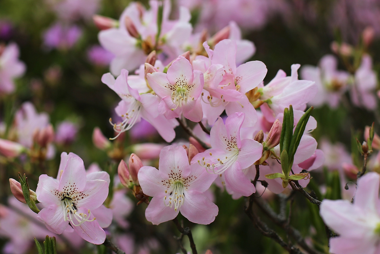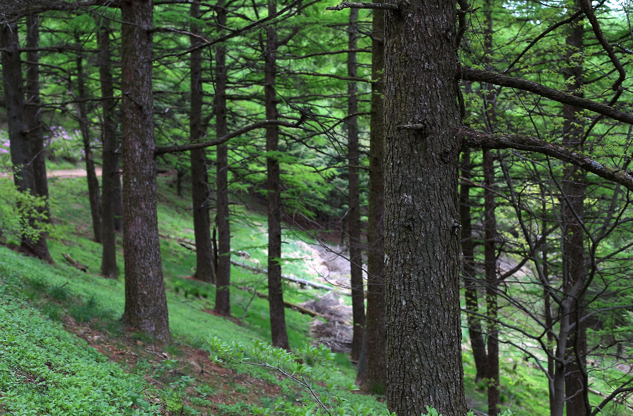 팔랑치 철쭉 군락지를 걸어가는 행위는 철쭉의 바닷속을 헤엄치는 것과 같다. 철쭉의 키가 어른 키를 훌쩍 넘기 때문이다. 특히 팔랑치 쪽으로 가는 길에 유난히 많은 흰색에 가까운 연분홍빛 철쭉나무는 키도 더 크고 이파리는 연둣빛이며 꽃잎은 더 둥글고 긴 눈썹은 하얗다. 철쭉의 얼굴에 있는 까만 죽은깨를 가리기에도 충분한 긴 눈썹은 어찌 그리 귀엽고 새침한지.