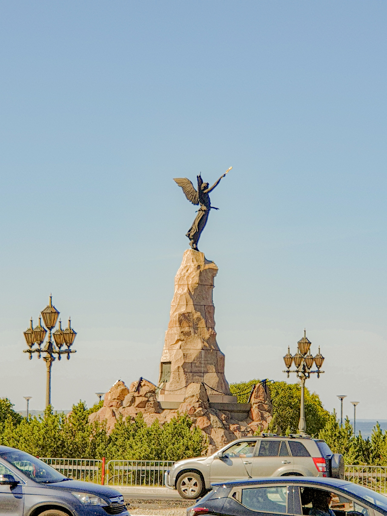 카드리오르그 공원이 끝나는 해안가에 서있는 천사상과 꽃을 든 사람