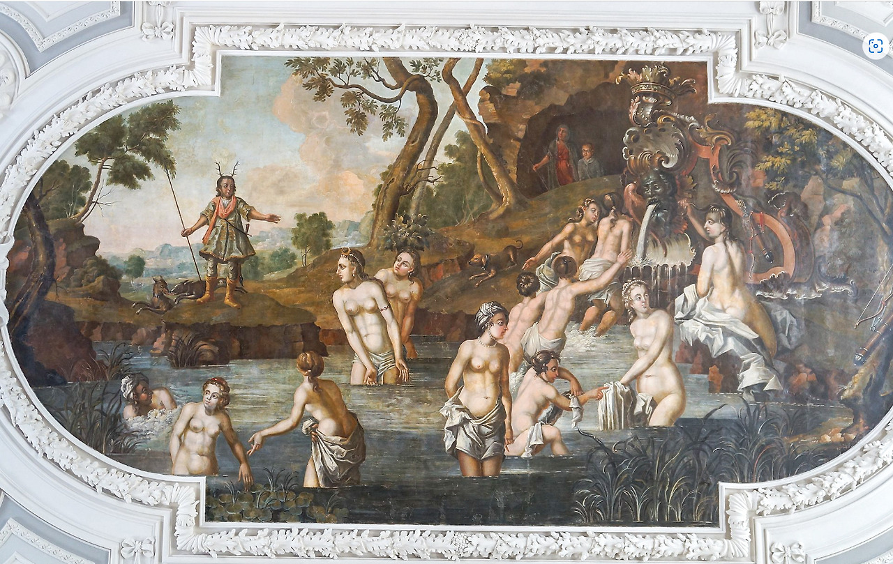 홀 천정에 있는 프레스코화는 신화 속에 자주 등장하는 오비디우스의 변신에 나오는 ‘아르테미스와 악타이온’이다. ‘변신’에 나오는 이야기는 정치 사회적 알레고리로 흔히 등장하는데 이 그림 또한 스웨덴과의 기나긴 대북방 전쟁에서 이긴 후 승리감에 도취된 상황을 그려 넣었다. 중앙에 나신으로 그려진 아르테미스(다이애나)는 달과 사냥의 신이며 순결을 상징하는 처녀의 신이다. 주로 숲과 야생에서 님프들과 생활하는 것으로 알려진 아르테미스는 그날도 여느 때처럼 님프들과 함께 호수에서 목욕을 하던 찰나였다. 사냥꾼으로 유명한 악타이온은 동료들의 대열에서 빠져나와 우연히 아르테미스와 님프들의 목욕 장면을 보게 된 것이다. 악타이온을 발견한 여신은 분노와 함께 물을 뿌려 저주를 내렸다. 악타이온의 머리에서 뿔이 솟아오르면서 그는 수사슴으로 변해갔다. 악타이온이 데리고 다니던 사냥개들은 사슴으로 변한 악타이온을 물어뜯어 죽였다고 한다. 혹은 아르테미스의 화살에 죽었다고도 한다. 그림에서 아르테미스 여신은 대북방 전쟁에서 승리한 표트르와 러시아이며, 막 뿔이 솟아나기 시작한 악타이온은 스웨덴이며 카를 12세를 의미한다.