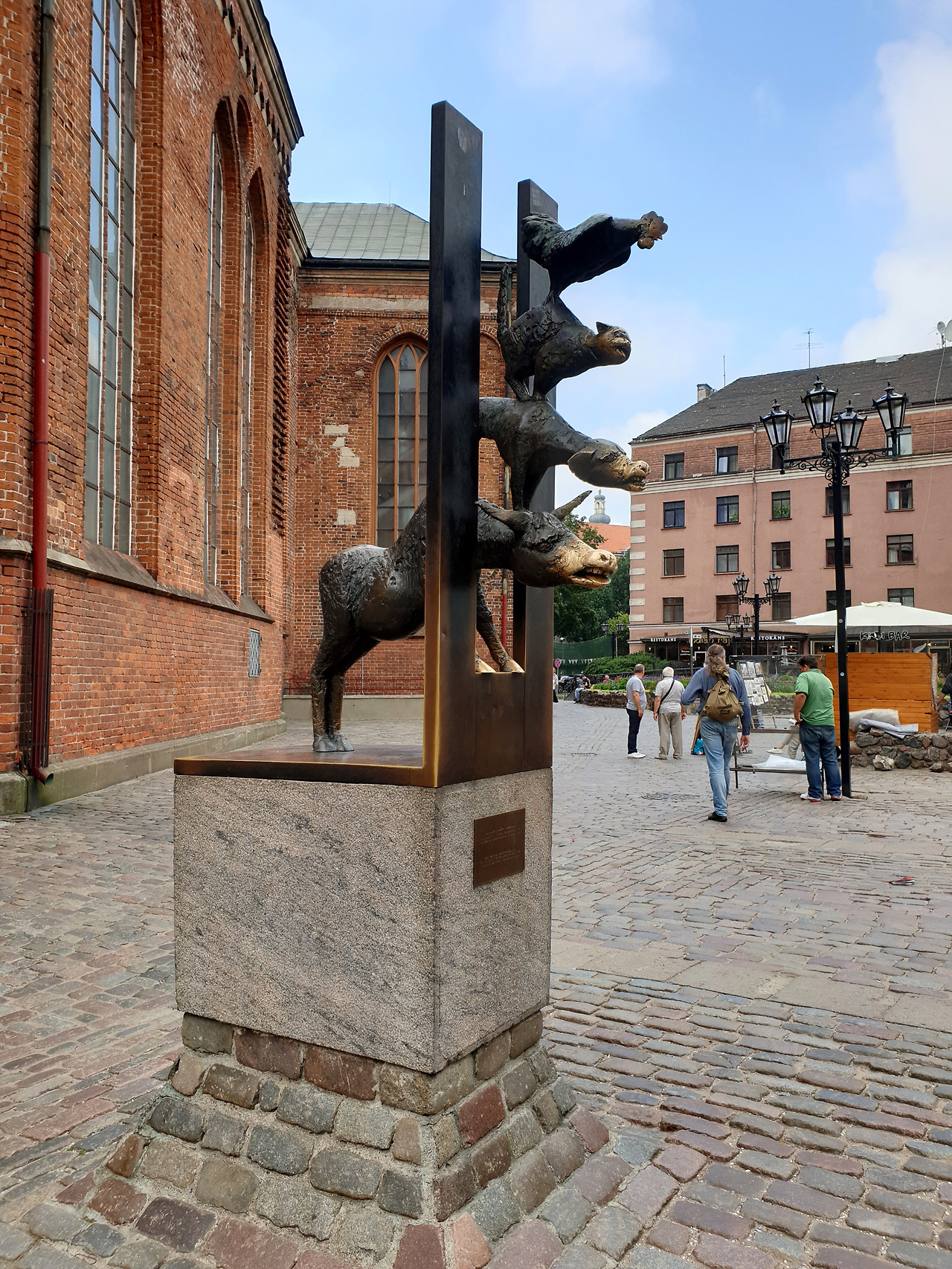‘브레멘 음악대’는 쓸모가 없어져 학대를 당하거나 버려지거나 죽을 위기에 놓인 네 마리의 동물들이 의기투합하여 자유로운 땅 브레멘으로 가는 여정을 그린 동화다. 코믹하고 행복하게 마무리를 지었지만 농노들의 힘든 삶이 투영된 이야기다. 브레멘 시는 알브레히트 주교가 리가에 들어온 것을 기념하여 리가 시에 브레멘 음악대 동상을 기증하였다. 침략자를 기념하는 의미의 구조물은 침략자인 알브레히트 주교와 독일 기사단을 각인시키는 행위가 아닌가. 알브레히트 주교의 살벌한 통치는 빛을 발하여 리가는 주교구에서 대주교구가 되었다.