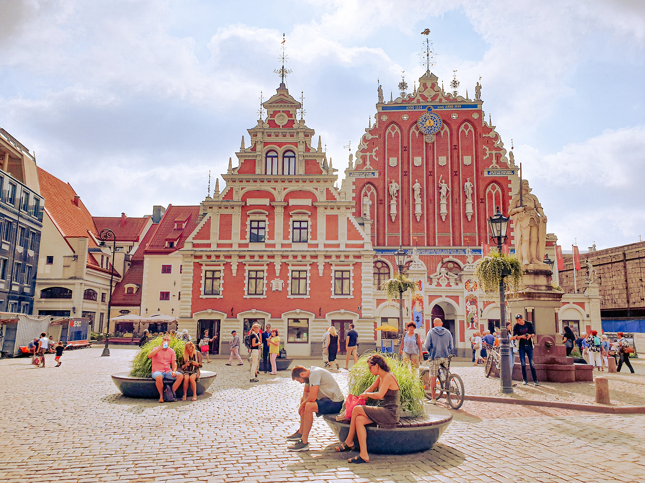 광장에서 만나는 검은 머리 전당의 동화적인 느낌의 외관은 사람을 들뜨게 만든다. 게오르기우스Georgius 형제단에서 분리되어 나온 Blackheads 형제단은 외국인인(주로 독일) 미혼 상인과 선주로 구성된 길드였다. 18세기 초, 건물이 길드의 완전한 소유가 된 이후에 꾸며진 파사드에는 검은 머리 길드를 상징하는 이미지들이 가득하다. 당시에도 너무나 특별한 건물은 1941년 독일군에 의해 파괴되었으며 다시 리가에 들어온 소련은 폐허화된 잔해를 치웠다. 현재의 건물은 리가에서 태어난 Parex Bank의 사장인 카르긴스Valērijs Kargins(1961~)가 제공한 자금을 바탕으로 하여 많은 기부자들의 노력으로 1999년 복원되었다.