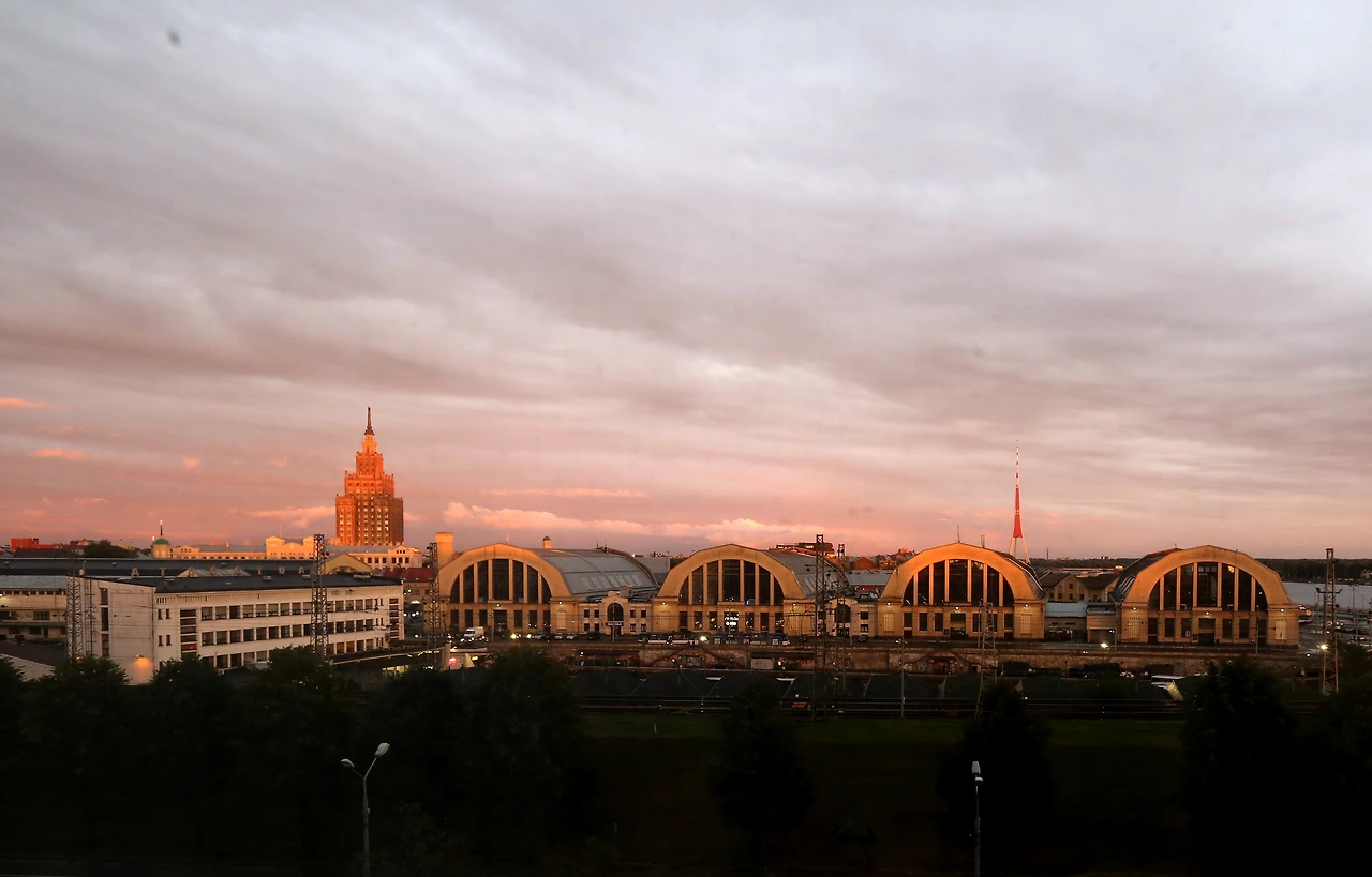비가 내린 후, 리가의 중앙시장 야경. 왼쪽에 '스탈린의 생일 케이크'라고도 부르는 '라트비아 과학원 건물'이 보인다.