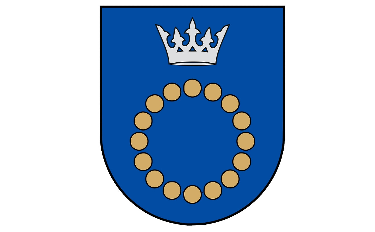 팔랑가의 문장, Jūratė 를 상징하는 은색 관과, 팔랑가의 전통적인 산업인 호박 구슬 문양의 조합이다.