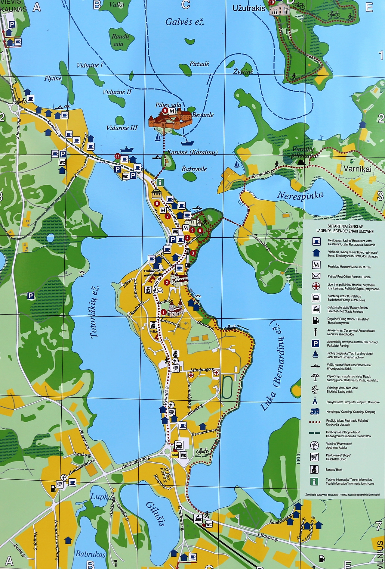 리투아니아에는 넓지 않은 국토에 2,800여 개의 호수가 있다. 트라카이를 방문하기 전에는 리투아니아가 호수의 나라인 것을 실감하지 못했다. 빌뉴스 기차역 옆에 있는 버스터미널에 가면 트라카이행 버스를 탈 수 있다. 빌뉴스에 도착하면서 시간도 확인할 겸 터미널을 방문해서 예매를 했다. 물론 기차로도 갈 수 있지만 버스의 운행 횟수가 많다. 시간에 여유가 있다면 당일 발권해도 무리는 없을 것 같다. 트라카이는 빌뉴스에서 서쪽으로 28킬로미터 거리에 위치한다. 30분가량 버스를 타고 트라카이에 도착했다. 버스에서 내리면 트라카이 안내도가 서 있다.
