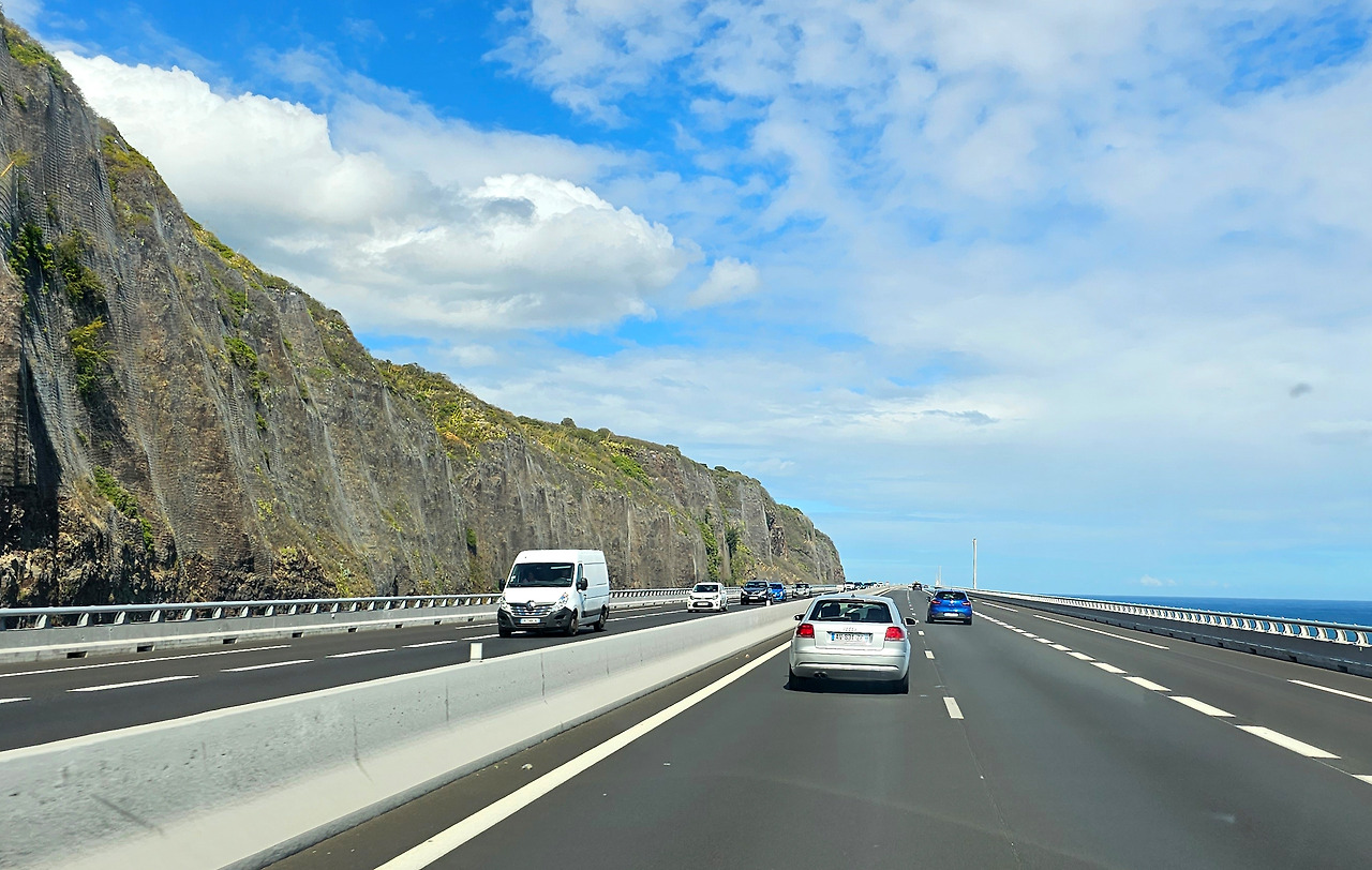 레위니옹의 순환도로, 오른쪽은 바다요, 왼쪽은 화산이다. 생 드니 근처의 풍경이다.