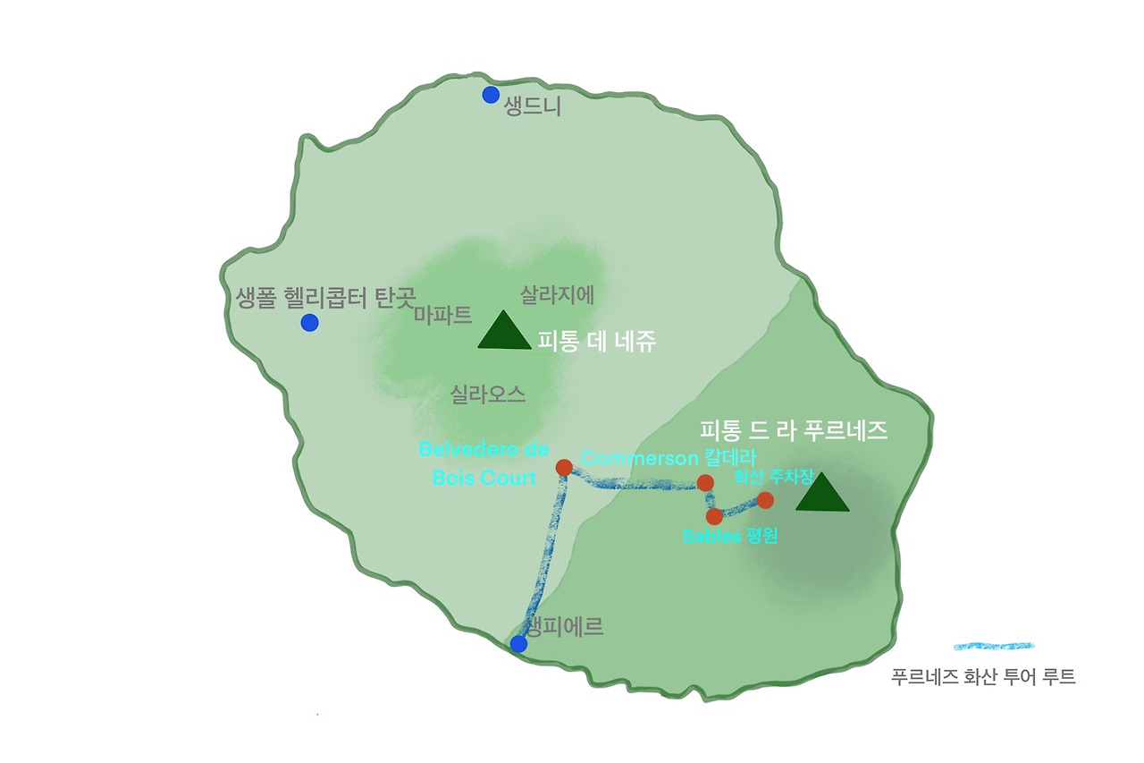 레위니옹은 완벽한 화산섬이다. 아래 지도를 보면 북쪽(피통 데 네쥬)과 남쪽(피통 드 라 푸르네즈) 두 개의 화산군으로 이루어졌음을 쉽게 알 수 있다. 윗부분에 있는 피통 데 네쥬 화산은 섬의 3분의 2를 차지하며 휴화산이다. 동남쪽의 피통 드 라 푸르네즈는 레위니옹의 3분의 1을 차지하며 언제든지 분출할 수 있는 매우 활발한 활화산이다. 프랑스 점령 이후 관측된 화산 분출은 지금까지 약 300회가 넘는다. 평균 1년에서 2년 사이에 한두 번은 분출한 횟수다.