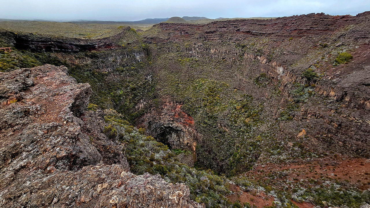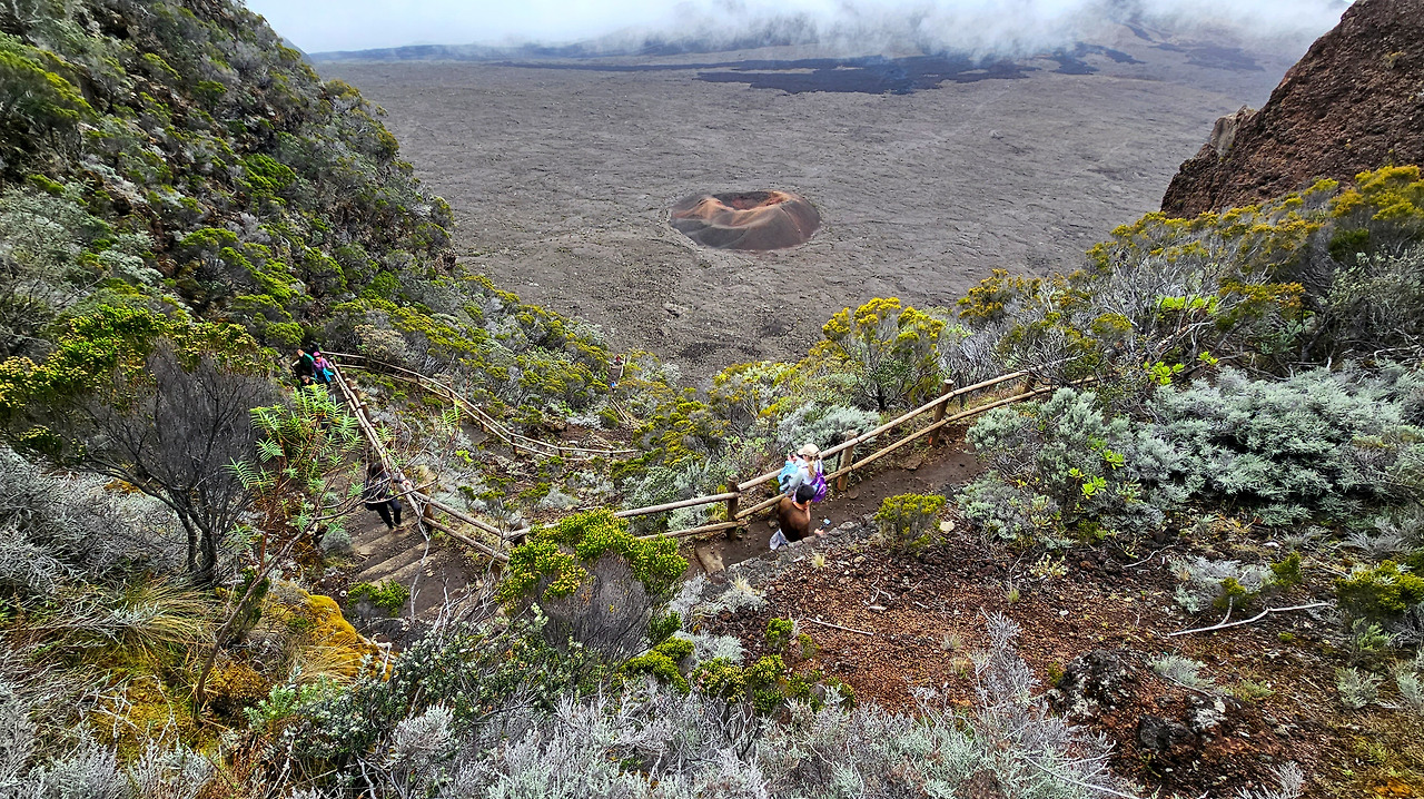 주차장에서 분화구 입구까지는 약 20여분 소요된다. 입구에는 수직으로 내려가는 절벽에 지그재그로 임도를 만들어놨다. 수직절벽은 화구의 절벽이 아니라 정확하게는 칼데라의 절벽이다. 엔클로 푸케 Enclos Fouqué 칼데라 안으로 들어가면 여러 개의 크고 작은 분화구들을 볼 수 있다. 수직절벽을 내려가서 처음 만나는 것은 끓어서 흘러내린 용암이 굳어 암석이 된 길이다. 용암이 볼륨감 있는 곡선을 그리며 흘러내린 자국은 경이로울 뿐만 아니라 아름다웠다. 그 위에 푸른색 식물들이 터를 잡았다. 푸르네즈는 순상화산이어서 용암도 천천히 흘러내렸을 것이다.