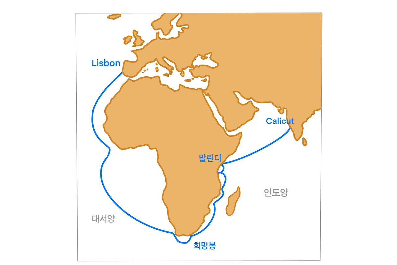 1497년, 바스쿠 다 가마 Vasco da Gama(1460~1524)의 캐러벨 선 3척과 보급선 한 척에는 180여 명의 선원이 탑승했다. 아프리카 연안선을 따라 내려가 희망봉을 발견한 바르톨로뮤 디아스는 아프리카 서부 연안을 타고 가지 말고 바다 한가운데로 돌아갈 것을 조언했다. 7월 8일, 타구스강을 출발한 함대는 바르톨로뮤 디아스의 조언을 받아들였다. 카보베르데 제도에 도착한 뒤 선대는 대서양 한가운데를 통과하여 4개월 후 희망봉에 닿았다. 대서양은 더디게 돌았지만 동아프리카 말린디에서 인도양을 가로지르는 시간은 출발한 지 채 한 달도 안 되었다. 아브라함 자쿠토의 천측력과 케냐의 말린디에서 만난 무슬림 항해 전문가인 이븐 마지드 Ahmad ibn Mājid 덕분이었다. 게다가 습도가 높고 거센 계절풍을 만난 것도 행운이었다. 함대는 1498년 5월 인도 서쪽에 있는 말라바르 해안에 상륙하였다. 가까운 항구 도시 캘리컷 Calicut(현재의 Kozhikode)은 지근거리였다. 드디어 인도와 포르투갈을 잇는 인도 항로를 개척한 것이다. 비록 1499년 귀국했을 때 살아 돌아온 선원은 50여 명에 불과했지만 말이다. 하지만 투자자들은 후추를 비롯한 향신료와 인도의 고급 직물인 캘리코(옥양목)등으로 투자원금의 60배에 해당하는 수익을 거뒀다.