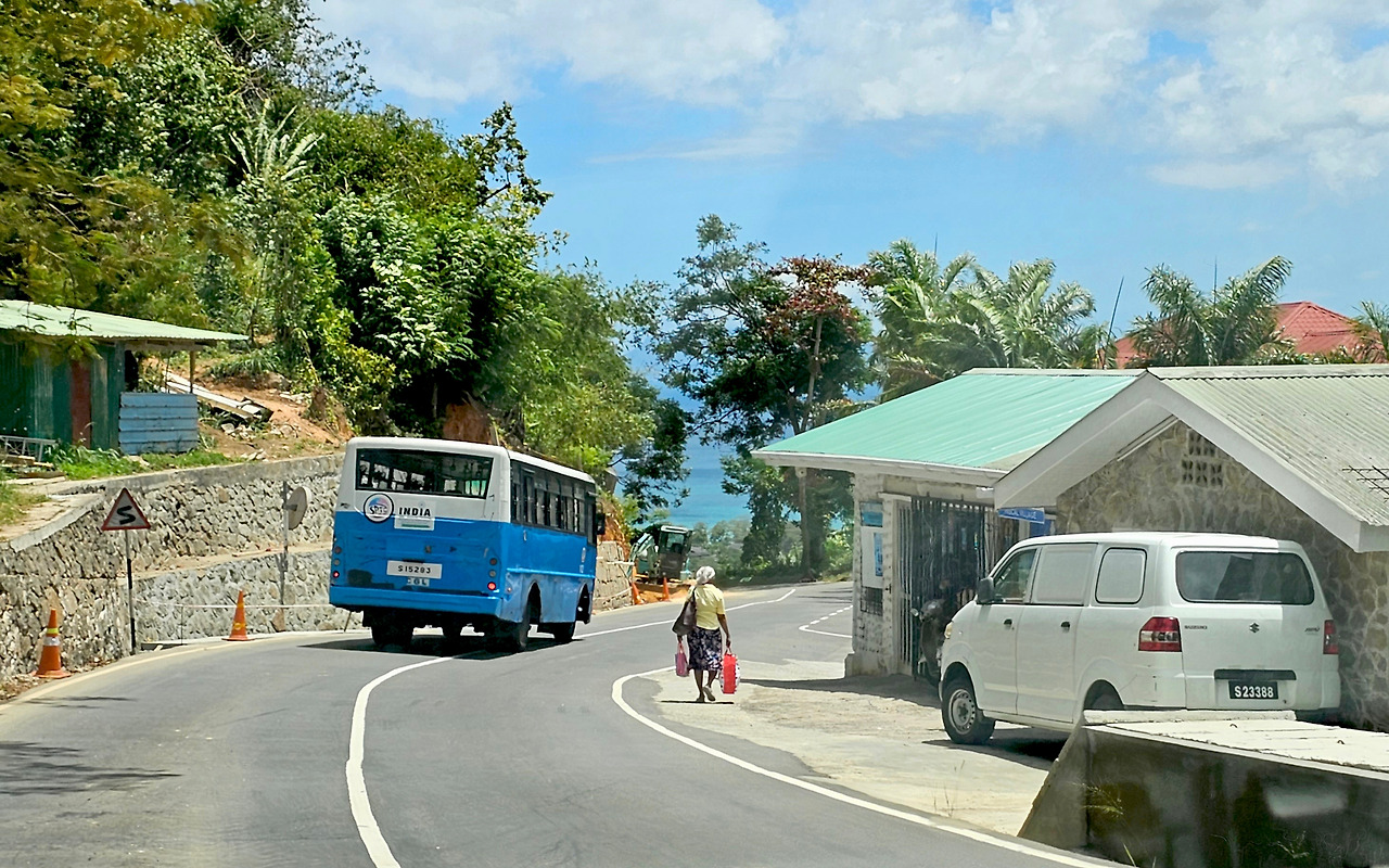 마에 섬을 돌면서 주민들의 발인 세이셸 공용버스(SPTC)와 앞서거니 뒤서거니 하면서 자주 만났다. 여행을 하면서 버스를 보면 무척 반갑다. 여행을 하는 방법에는 여러 가지가 있지만 현지 교통수단을 이용하는 것을 좋아한다. 물론 시간에 여유가 있을 때 이야기이지만 말이다. 현지교통수단의 가장 큰 장점은 안전이다. 또한 현지의 지리와 교통에 매우 친숙해지며 그곳의 사람들을 만날 수 있다. 푸른색 버스의 뒤를 따라가다가 버스 밑동에 칠해진 바다색이 바다와 만날 때는 버스와 바다가 하나로 보이기도 한다.
